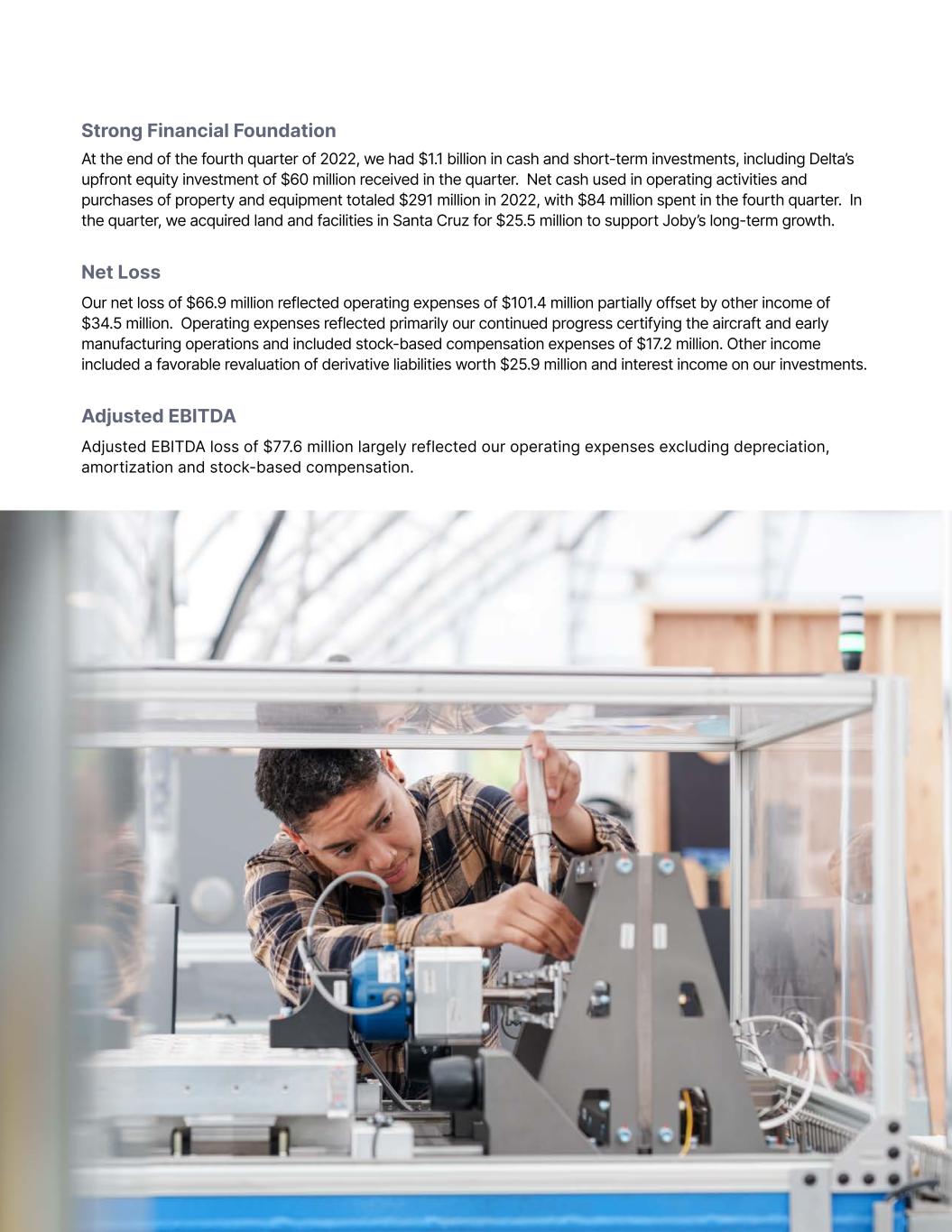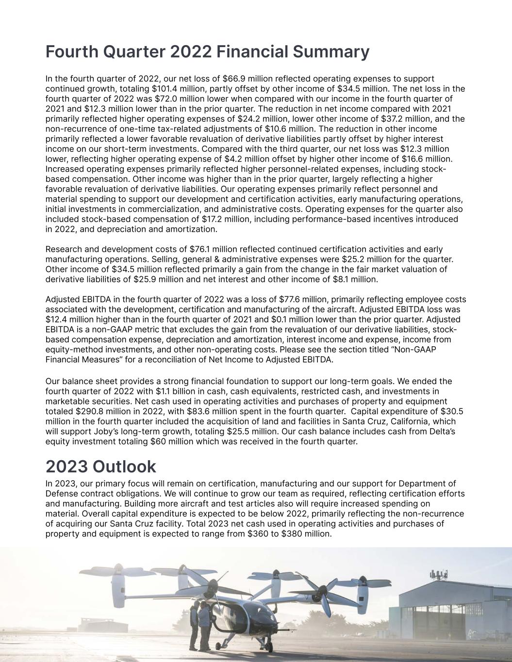 Fourth Quarter 2022 Financial Summary In the fourth quarter of 2022, our net loss of $66.9 million reflected operating expenses to support continued growth, totaling $101.4 million, partly offset by other income of $34.5 million. The net loss in the fourth quarter of 2022 was $72.0 million lower when compared with our income in the fourth quarter of 2021 and $12.3 million lower than in the prior quarter. The reduction in net income compared with 2021 primarily reflected higher operating expenses of $24.2 million, lower other income of $37.2 million, and the non-recurrence of one-time tax-related adjustments of $10.6 million. The reduction in other income primarily reflected a lower favorable revaluation of derivative liabilities partly offset by higher interest income on our short-term investments. Compared with the third quarter, our net loss was $12.3 million lower, reflecting higher operating expense of $4.2 million offset by higher other income of $16.6 million.  Increased operating expenses primarily reflected higher personnel-related expenses, including stock- based compensation. Other income was higher than in the prior quarter, largely reflecting a higher favorable revaluation of derivative liabilities. Our operating expenses primarily reflect personnel and material spending to support our development and certification activities, early manufacturing operations, initial investments in commercialization, and administrative costs. Operating expenses for the quarter also included stock-based compensation of $17.2 million, including performance-based incentives introduced in 2022, and depreciation and amortization. Research and development costs of $76.1 million reflected continued certification activities and early manufacturing operations. Selling, general & administrative expenses were $25.2 million for the quarter. Other income of $34.5 million reflected primarily a gain from the change in the fair market valuation of derivative liabilities of $25.9 million and net interest and other income of $8.1 million. Adjusted EBITDA in the fourth quarter of 2022 was a loss of $77.6 million, primarily reflecting employee costs associated with the development, certification and manufacturing of the aircraft. Adjusted EBITDA loss was $12.4 million higher than in the fourth quarter of 2021 and $0.1 million lower than the prior quarter. Adjusted EBITDA is a non-GAAP metric that excludes the gain from the revaluation of our derivative liabilities, stock- based compensation expense, depreciation and amortization, interest income and expense, income from equity-method investments, and other non-operating costs. Please see the section titled “Non-GAAP Financial Measures” for a reconciliation of Net Income to Adjusted EBITDA. Our balance sheet provides a strong financial foundation to support our long-term goals. We ended the fourth quarter of 2022 with $1.1 billion in cash, cash equivalents, restricted cash, and investments in marketable securities. Net cash used in operating activities and purchases of property and equipment totaled $290.8 million in 2022, with $83.6 million spent in the fourth quarter.  Capital expenditure of $30.5 million in the fourth quarter included the acquisition of land and facilities in Santa Cruz, California, which will support Joby’s long-term growth, totaling $25.5 million. Our cash balance includes cash from Delta’s equity investment totaling $60 million which was received in the fourth quarter. 2023 Outlook In 2023, our primary focus will remain on certification, manufacturing and our support for Department of Defense contract obligations. We will continue to grow our team as required, reflecting certification efforts and manufacturing. Building more aircraft and test articles also will require increased spending on material. Overall capital expenditure is expected to be below 2022, primarily reflecting the non-recurrence of acquiring our Santa Cruz facility. Total 2023 net cash used in operating activities and purchases of property and equipment is expected to range from $360 to $380 million.