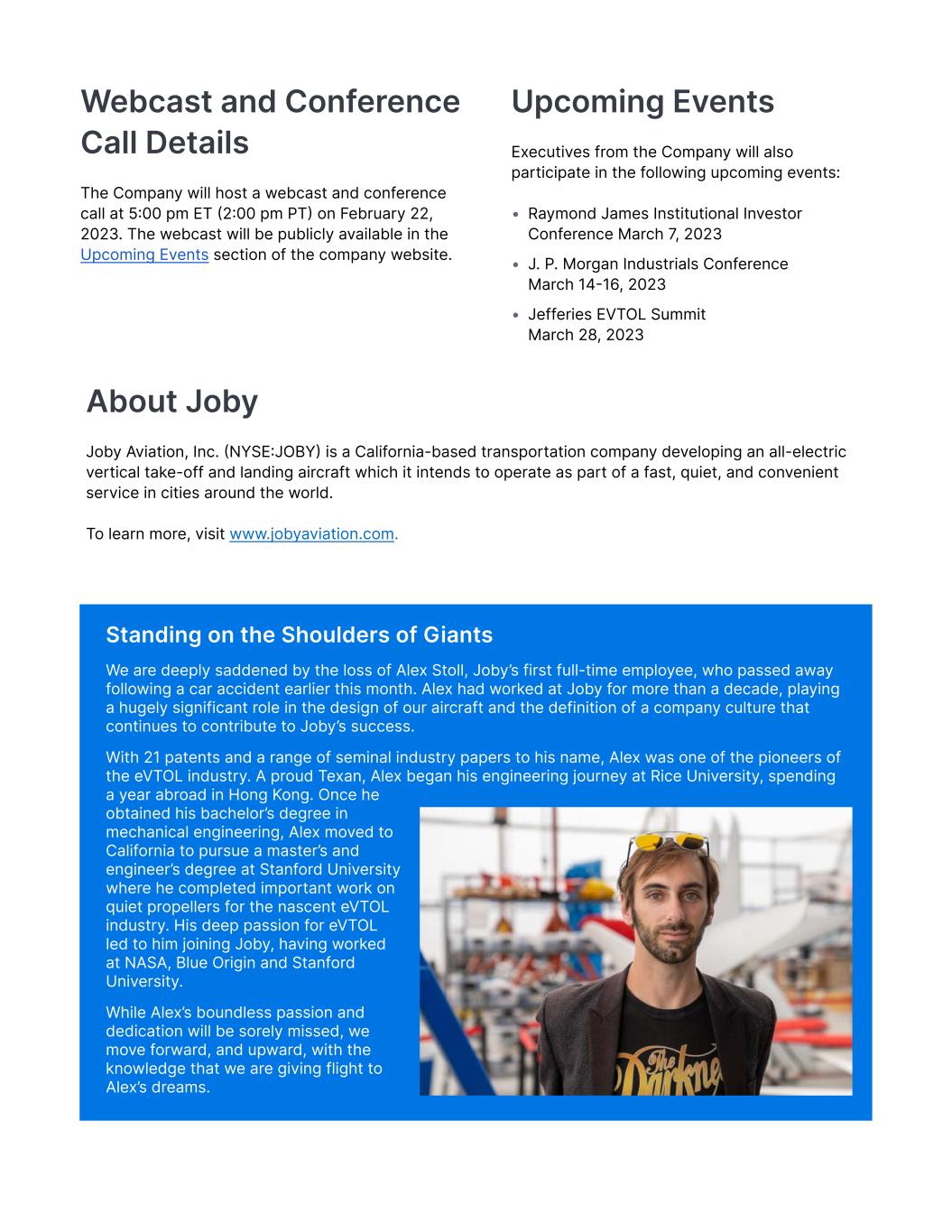 Webcast and Conference Call Details The Company will host a webcast and conference call at 5:00 pm ET (2:00 pm PT) on February 22, 2023. The webcast will be publicly available in the Upcoming Events section of the company website.     11 Upcoming Events Executives from the Company will also participate in the following upcoming events: • Raymond James Institutional Investor Conference March 7, 2023 • J. P. Morgan Industrials Conference March 14-16, 2023 • Jefferies EVTOL Summit March 28, 2023 About Joby Joby Aviation, Inc. (NYSE:JOBY) is a California-based transportation company developing an all-electric vertical take-off and landing aircraft which it intends to operate as part of a fast, quiet, and convenient service in cities around the world. To learn more, visit www.jobyaviation.com. Standing on the Shoulders of Giants We are deeply saddened by the loss of Alex Stoll, Joby’s first full-time employee, who passed away following a car accident earlier this month. Alex had worked at Joby for more than a decade, playing a hugely significant role in the design of our aircraft and the definition of a company culture that continues to contribute to Joby’s success. With 21 patents and a range of seminal industry papers to his name, Alex was one of the pioneers of the eVTOL industry. A proud Texan, Alex began his engineering journey at Rice University, spending a year abroad in Hong Kong. Once he obtained his bachelor’s degree in mechanical engineering, Alex moved to California to pursue a master’s and engineer’s degree at Stanford University where he completed important work on quiet propellers for the nascent eVTOL industry. His deep passion for eVTOL led to him joining Joby, having worked at NASA, Blue Origin and Stanford University. While Alex’s boundless passion and dedication will be sorely missed, we move forward, and upward, with the knowledge that we are giving flight to Alex’s dreams.