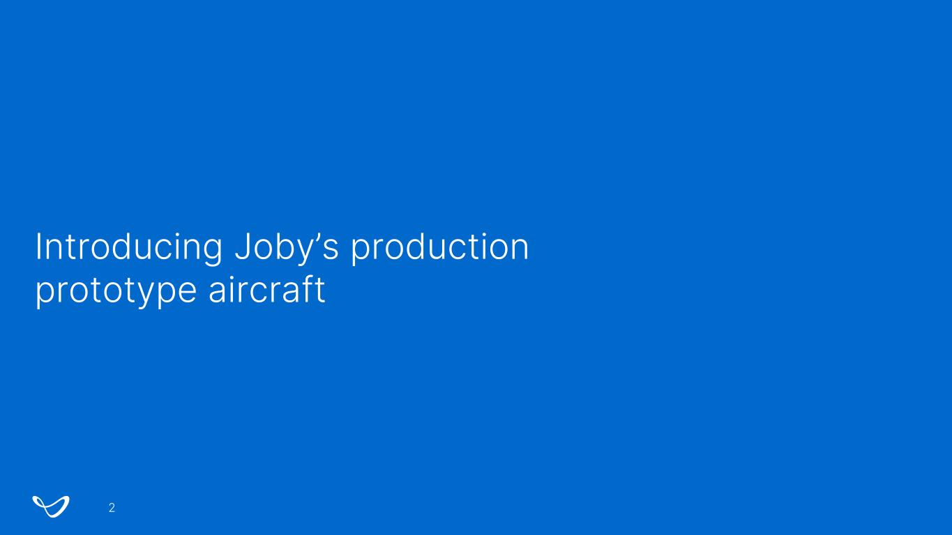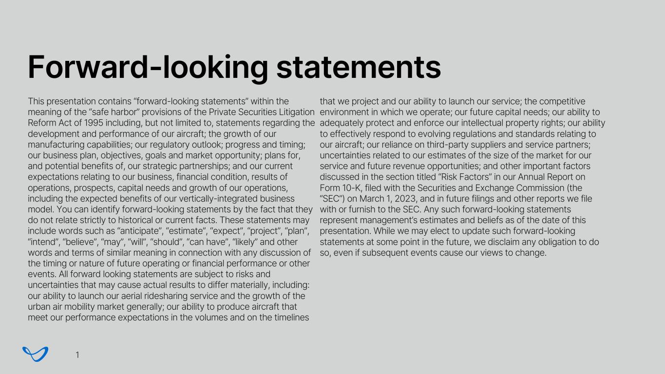 Forward-looking statements 1 This presentation contains “forward-looking statements” within the meaning of the “safe harbor” provisions of the Private Securities Litigation Reform Act of 1995 including, but not limited to, statements regarding the development and performance of our aircraft; the growth of our manufacturing capabilities; our regulatory outlook; progress and timing; our business plan, objectives, goals and market opportunity; plans for, and potential benefits of, our strategic partnerships; and our current expectations relating to our business, financial condition, results of operations, prospects, capital needs and growth of our operations, including the expected benefits of our vertically-integrated business model. You can identify forward-looking statements by the fact that they do not relate strictly to historical or current facts. These statements may include words such as “anticipate”, “estimate”, “expect”, “project”, “plan”, “intend”, “believe”, “may”, “will”, “should”, “can have”, “likely” and other words and terms of similar meaning in connection with any discussion of the timing or nature of future operating or financial performance or other events. All forward looking statements are subject to risks and uncertainties that may cause actual results to differ materially, including: our ability to launch our aerial ridesharing service and the growth of the urban air mobility market generally; our ability to produce aircraft that meet our performance expectations in the volumes and on the timelines that we project and our ability to launch our service; the competitive environment in which we operate; our future capital needs; our ability to adequately protect and enforce our intellectual property rights; our ability to effectively respond to evolving regulations and standards relating to our aircraft; our reliance on third-party suppliers and service partners; uncertainties related to our estimates of the size of the market for our service and future revenue opportunities; and other important factors discussed in the section titled “Risk Factors” in our Annual Report on Form 10-K, filed with the Securities and Exchange Commission (the “SEC”) on March 1, 2023, and in future filings and other reports we file with or furnish to the SEC. Any such forward-looking statements represent management’s estimates and beliefs as of the date of this presentation. While we may elect to update such forward-looking statements at some point in the future, we disclaim any obligation to do so, even if subsequent events cause our views to change.