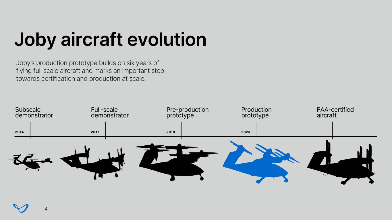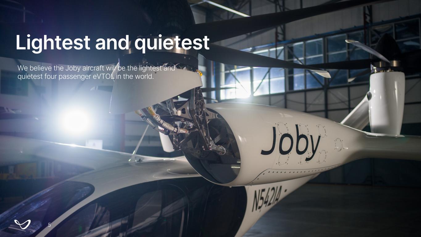 Lightest and quietest We believe the Joby aircraft will be the lightest and quietest four passenger eVTOL in the world. 5
