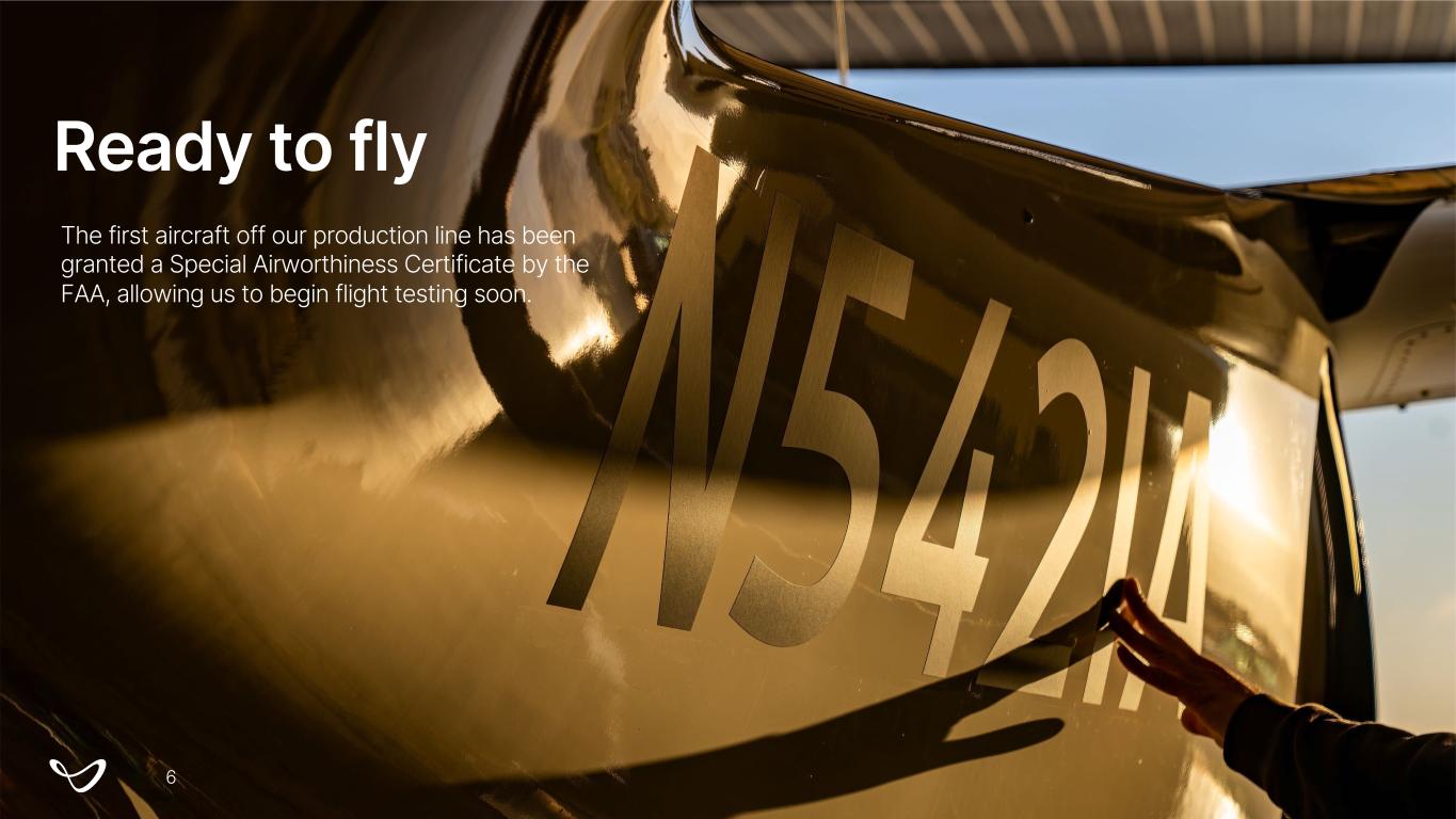Ready to fly The first aircraft off our production line has been granted a Special Airworthiness Certificate by the FAA, allowing us to begin flight testing soon. 6