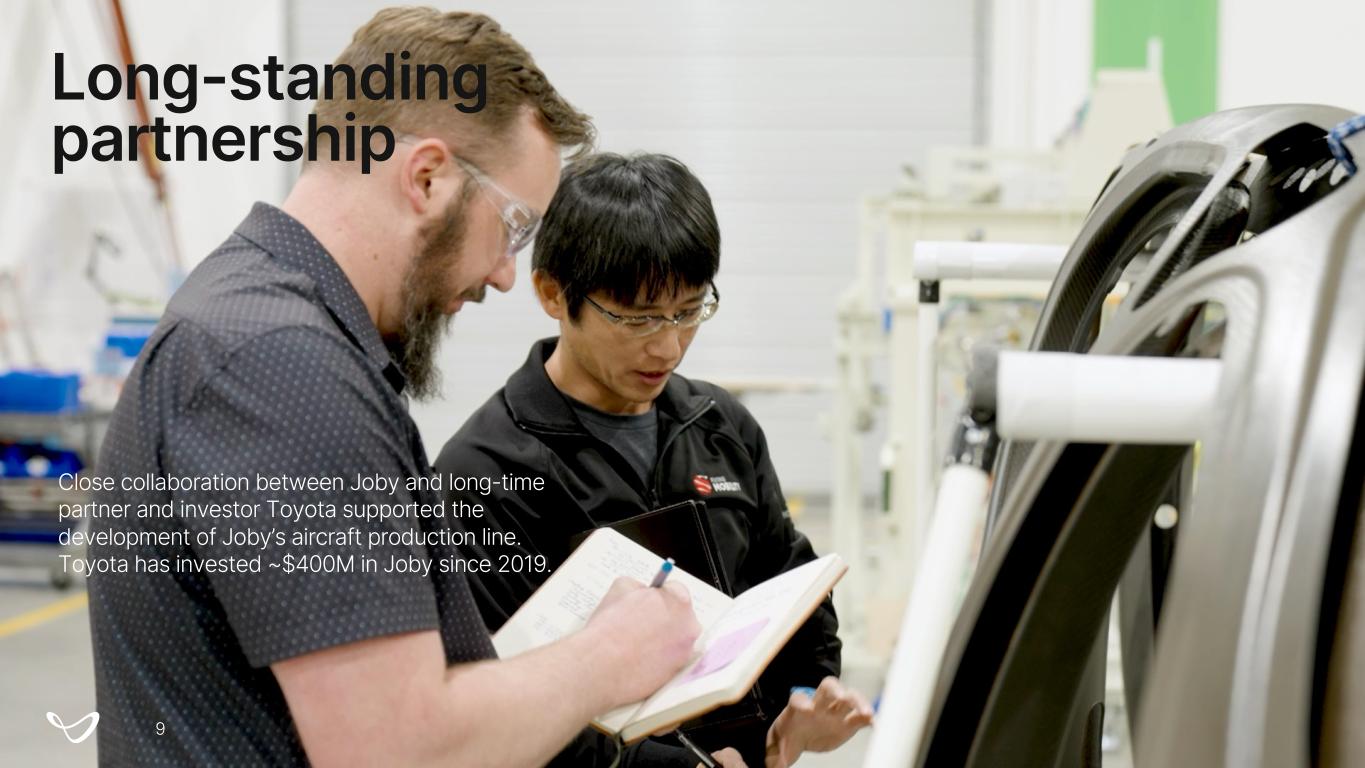 Close collaboration between Joby and long-time partner and investor Toyota supported the development of Joby’s aircraft production line. Toyota has invested ~$400M in Joby since 2019. Long-standing partnership 9