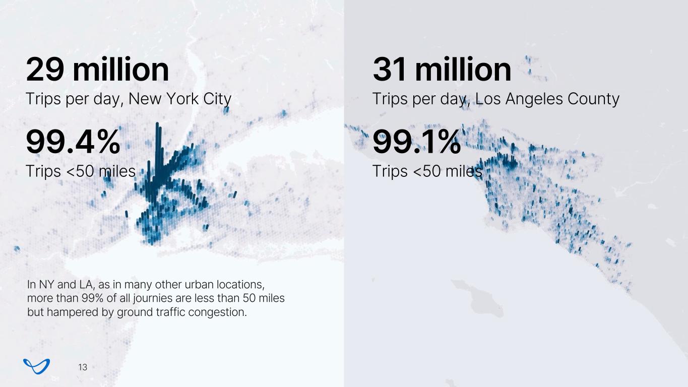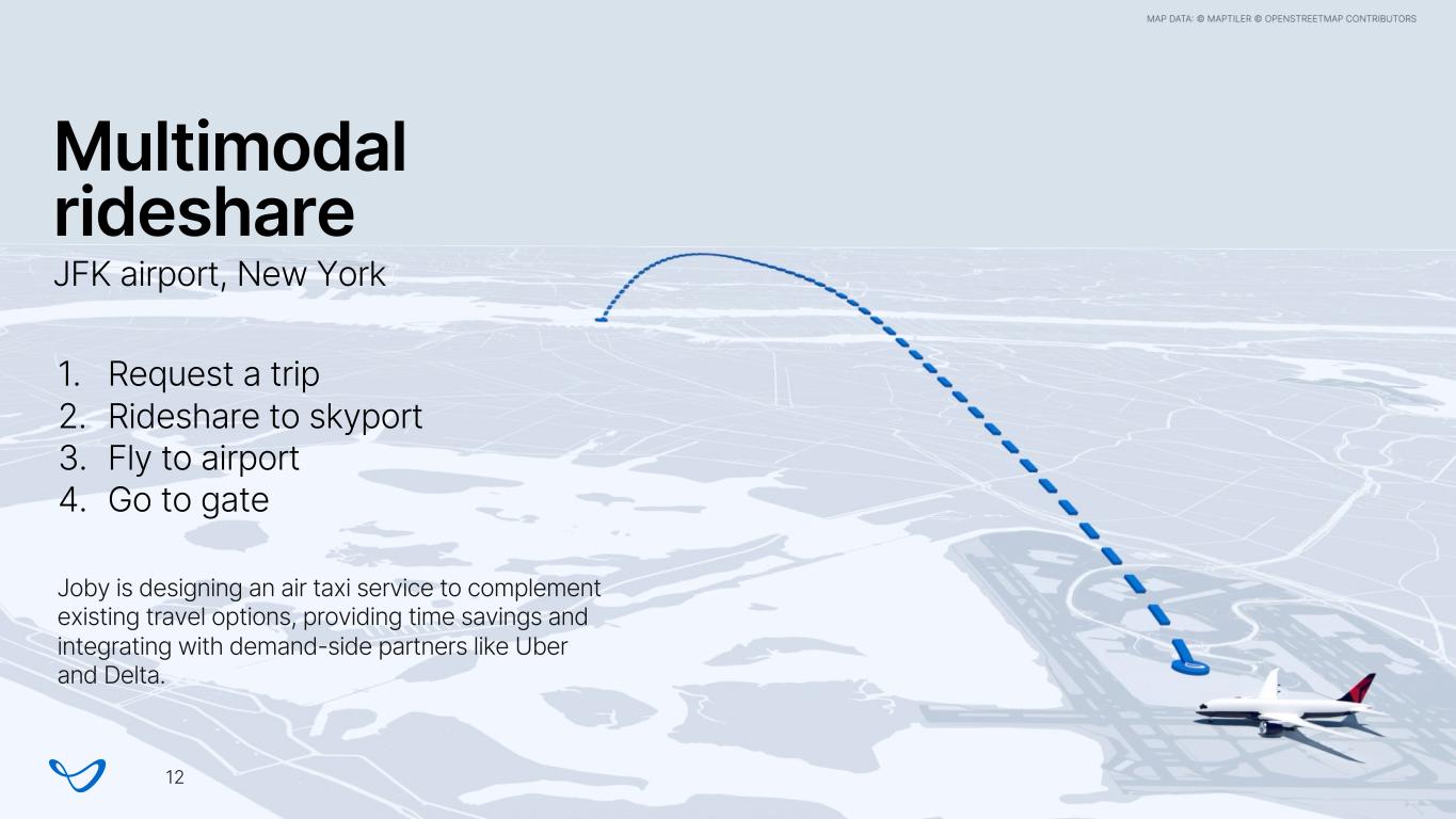 Multimodal rideshare JFK airport, New York 1. Request a trip 2. Rideshare to skyport 3. Fly to airport 4. Go to gate Joby is designing an air taxi service to complement existing travel options, providing time savings and integrating with demand-side partners like Uber and Delta. 12
