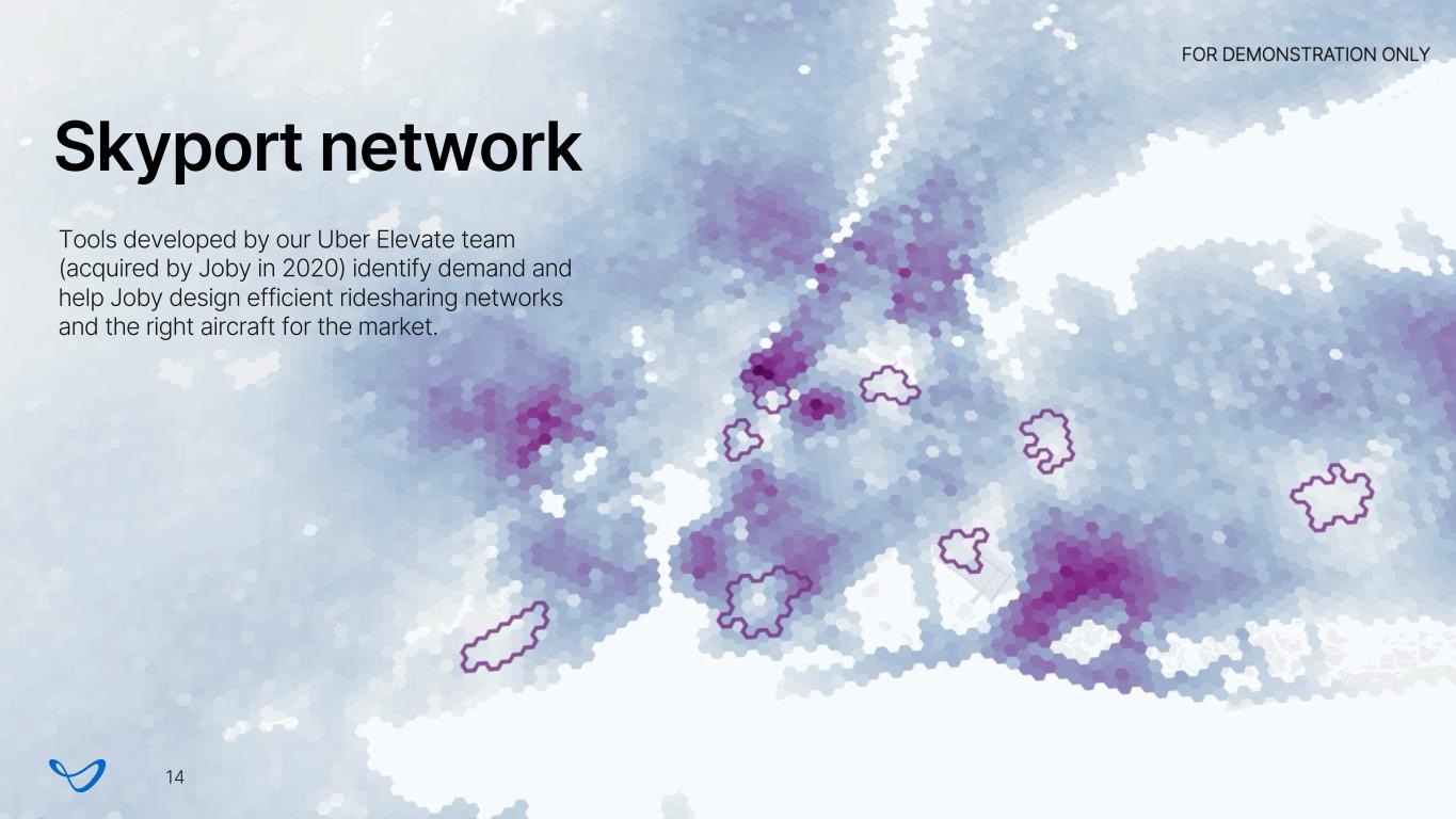 Tools developed by our Uber Elevate team (acquired by Joby in 2020) identify demand and help Joby design efficient ridesharing networks and the right aircraft for the market. Skyport network 14