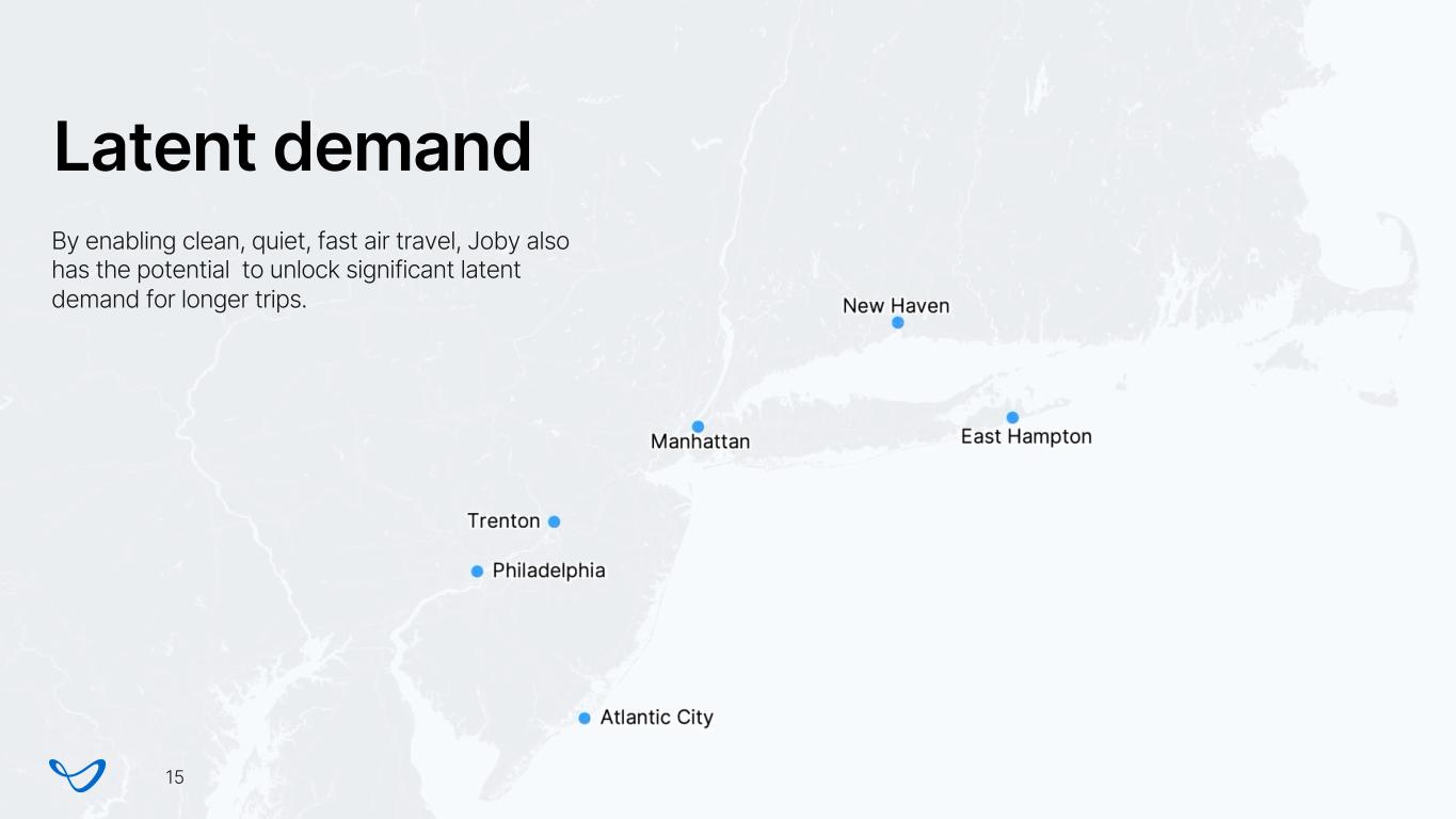 Latent demand By enabling clean, quiet, fast air travel, Joby also has the potential to unlock significant latent demand for longer trips. 15