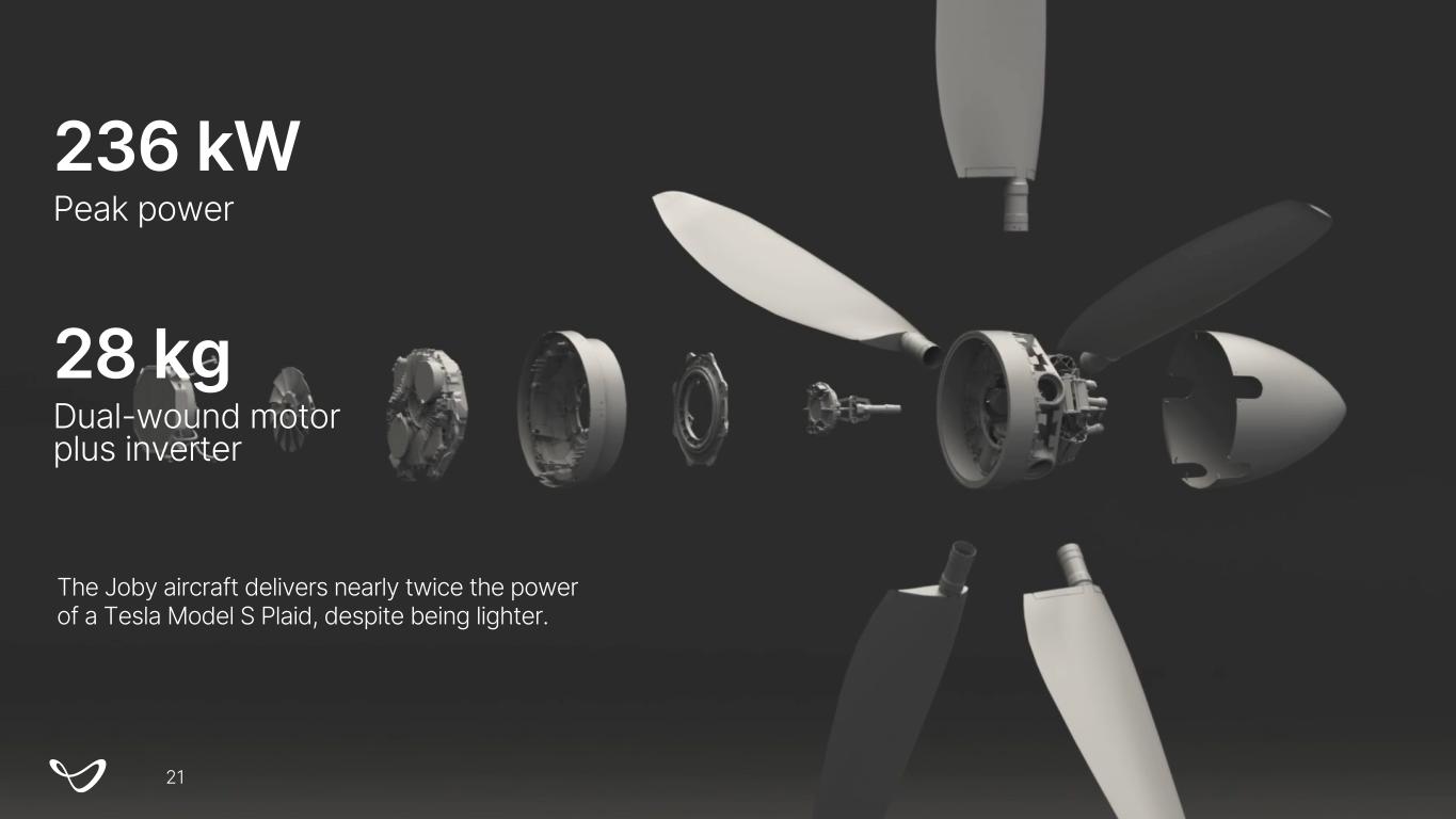 236 kW Peak power 28 kg Dual-wound motor plus inverter The Joby aircraft delivers nearly twice the power of a Tesla Model S Plaid, despite being lighter. 21
