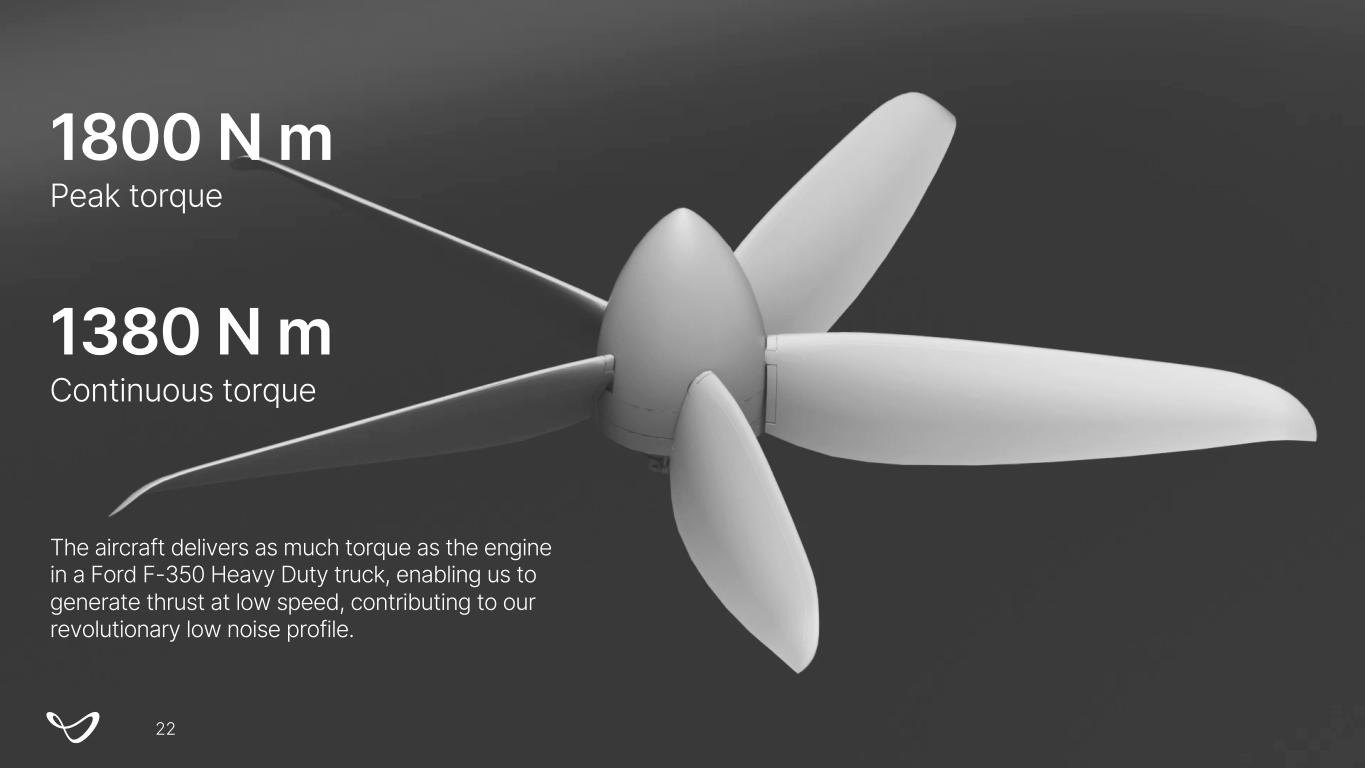 1800 N m Peak torque 1380 N m Continuous torque The aircraft delivers as much torque as the engine in a Ford F-350 Heavy Duty truck, enabling us to generate thrust at low speed, contributing to our revolutionary low noise profile. 22