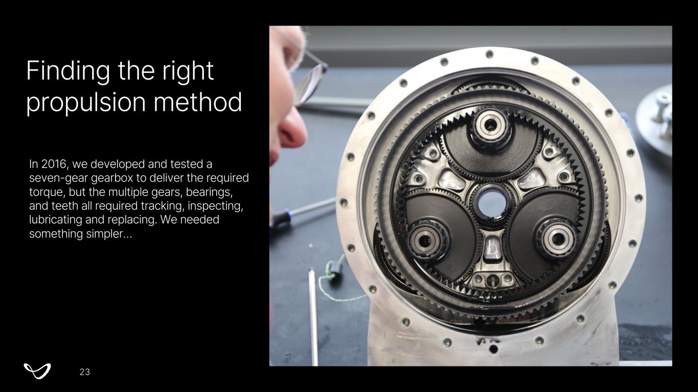 Finding the right propulsion method In 2016, we developed and tested a seven-gear gearbox to deliver the required torque, but the multiple gears, bearings, and teeth all required tracking, inspecting, lubricating and replacing. We needed something simpler… 23