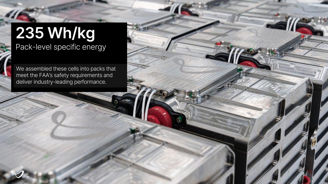 235 Wh/kg Pack-level specific energy We assembled these cells into packs that meet the FAA’s safety requirements and deliver industry-leading performance. 27