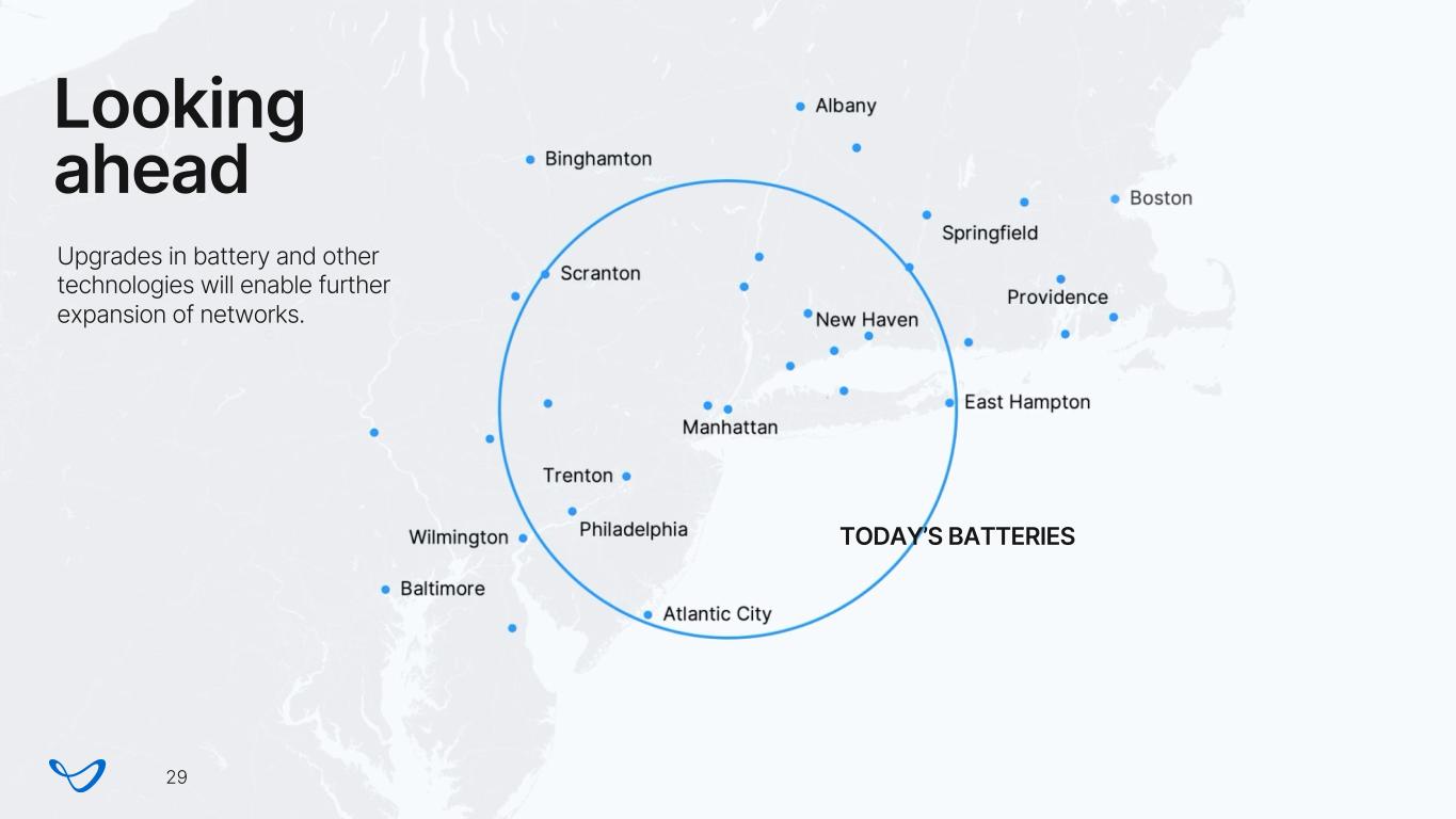 Rapid charging We expect to be able to recharge the aircraft in the time it takes to deplane and load passengers on more than 95% of trips taken today in our target markets. 28