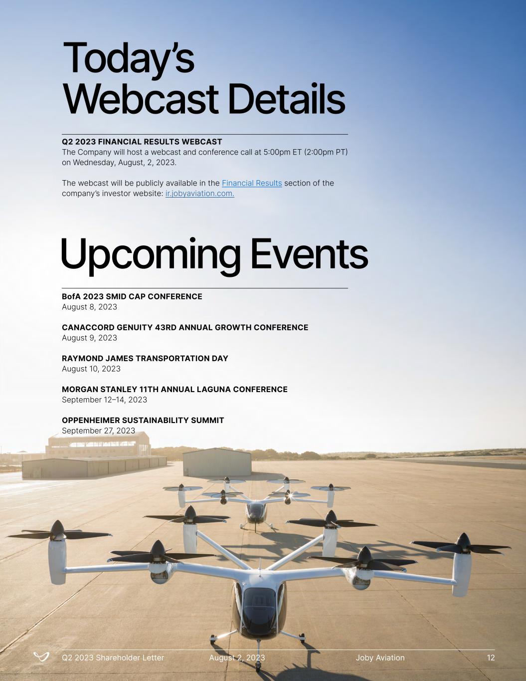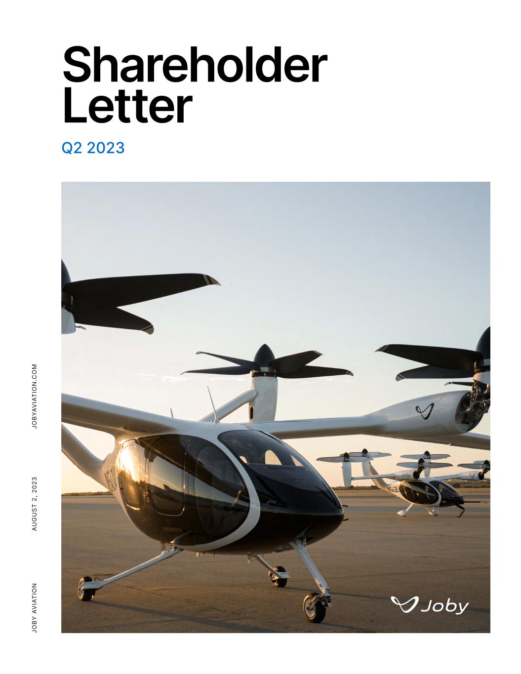 Upcoming Events Today’s Webcast Details Q2 2023 FINANCIAL RESULTS WEBCAST The Company will host a webcast and conference call at 5:00pm ET (2:00pm PT) on Wednesday, August, 2, 2023. The webcast will be publicly available in the Financial Results section of the company’s investor website: ir.jobyaviation.com. BofA 2023 SMID CAP CONFERENCE August 8, 2023 CANACCORD GENUITY 43RD ANNUAL GROWTH CONFERENCE August 9, 2023 RAYMOND JAMES TRANSPORTATION DAY August 10, 2023 MORGAN STANLEY 11TH ANNUAL LAGUNA CONFERENCE September 12–14, 2023 OPPENHEIMER SUSTAINABILITY SUMMIT September 27, 2023 Joby AviationQ2 2023 Shareholder Letter August 2, 2023 12