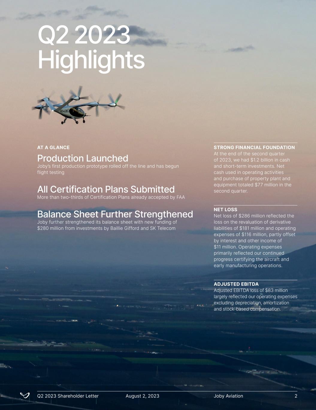 AT A GLANCE Production Launched Joby’s first production prototype rolled off the line and has begun flight testing All Certification Plans Submitted More than two-thirds of Certification Plans already accepted by FAA Balance Sheet Further Strengthened Joby further strengthened its balance sheet with new funding of $280 million from investments by Baillie Gifford and SK Telecom STRONG FINANCIAL FOUNDATION At the end of the second quarter of 2023, we had $1.2 billion in cash and short-term investments. Net cash used in operating activities and purchase of property plant and equipment totaled $77 million in the second quarter. NET LOSS Net loss of $286 million reflected the loss on the revaluation of derivative liabilities of $181 million and operating expenses of $116 million, partly offset by interest and other income of $11 million. Operating expenses primarily reflected our continued progress certifying the aircraft and early manufacturing operations. ADJUSTED EBITDA Adjusted EBITDA loss of $83 million largely reflected our operating expenses excluding depreciation, amortization and stock-based compensation. Q2 2023 Highlights Joby AviationQ2 2023 Shareholder Letter August 2, 2023 2