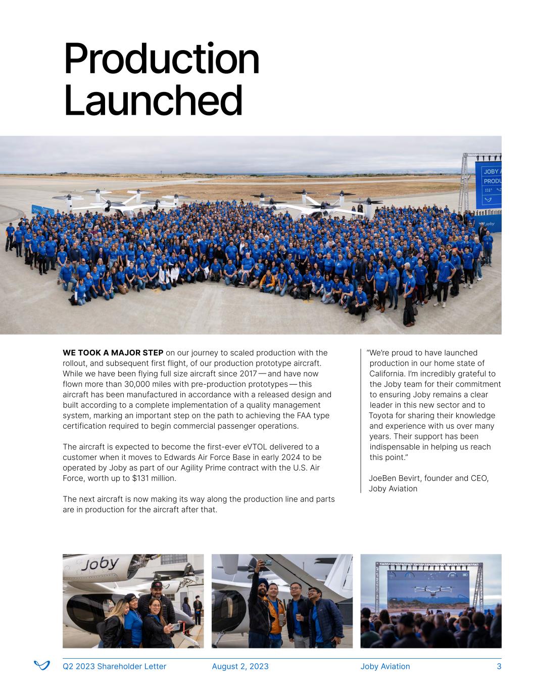 WE TOOK A MAJOR STEP on our journey to scaled production with the rollout, and subsequent first flight, of our production prototype aircraft. While we have been flying full size aircraft since 2017 — and have now flown more than 30,000 miles with pre-production prototypes — this aircraft has been manufactured in accordance with a released design and built according to a complete implementation of a quality management system, marking an important step on the path to achieving the FAA type certification required to begin commercial passenger operations. The aircraft is expected to become the first-ever eVTOL delivered to a customer when it moves to Edwards Air Force Base in early 2024 to be operated by Joby as part of our Agility Prime contract with the U.S. Air Force, worth up to $131 million. The next aircraft is now making its way along the production line and parts are in production for the aircraft after that. “We’re proud to have launched production in our home state of California. I’m incredibly grateful to the Joby team for their commitment to ensuring Joby remains a clear leader in this new sector and to Toyota for sharing their knowledge and experience with us over many years. Their support has been indispensable in helping us reach this point.” JoeBen Bevirt, founder and CEO, Joby Aviation Production Launched Joby AviationQ2 2023 Shareholder Letter August 2, 2023 3