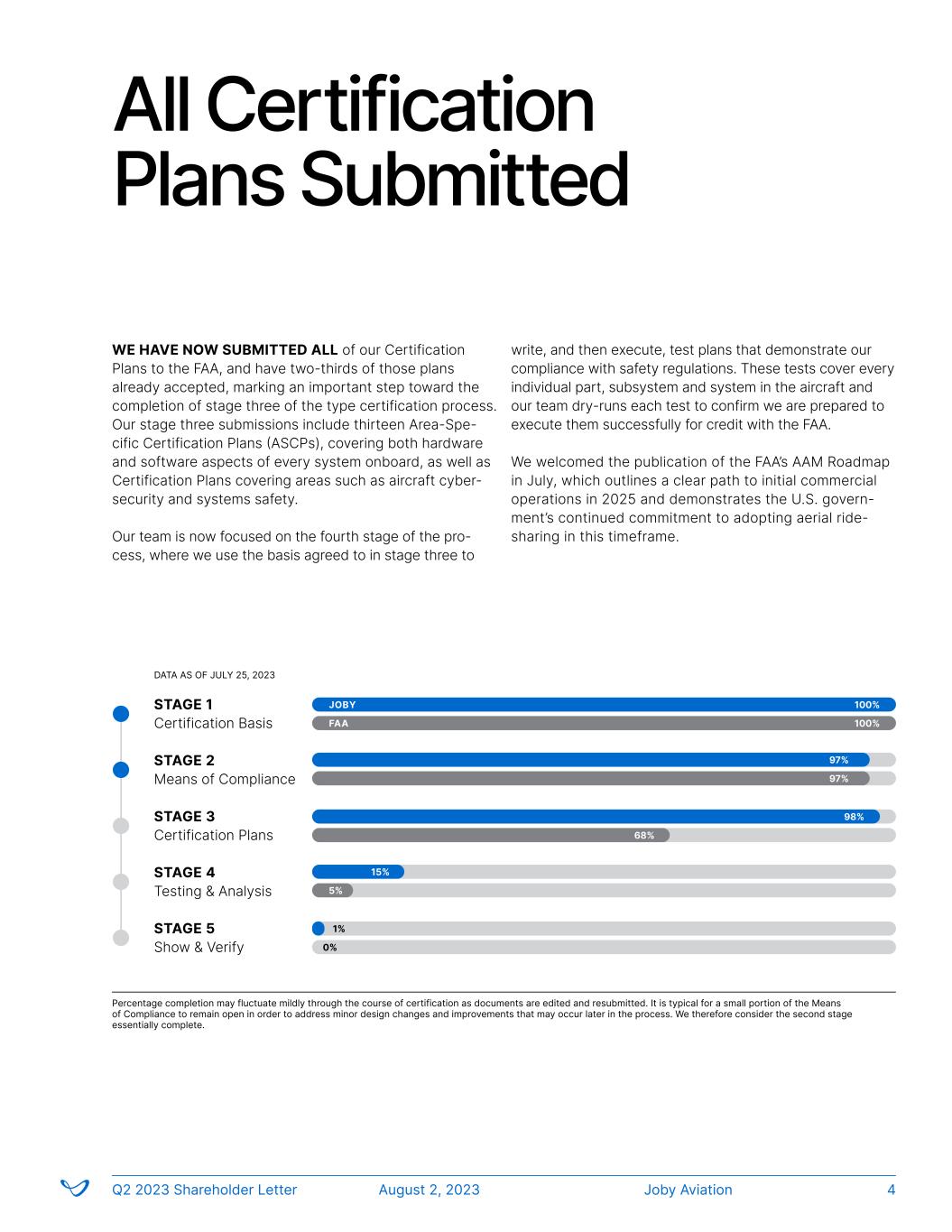 All Certification Plans Submitted WE HAVE NOW SUBMITTED ALL of our Certification Plans to the FAA, and have two-thirds of those plans already accepted, marking an important step toward the completion of stage three of the type certification process. Our stage three submissions include thirteen Area-Spe- cific Certification Plans (ASCPs), covering both hardware and software aspects of every system onboard, as well as Certification Plans covering areas such as aircraft cyber- security and systems safety. Our team is now focused on the fourth stage of the pro- cess, where we use the basis agreed to in stage three to write, and then execute, test plans that demonstrate our compliance with safety regulations. These tests cover every individual part, subsystem and system in the aircraft and our team dry-runs each test to confirm we are prepared to execute them successfully for credit with the FAA. We welcomed the publication of the FAA’s AAM Roadmap in July, which outlines a clear path to initial commercial operations in 2025 and demonstrates the U.S. govern- ment’s continued commitment to adopting aerial ride- sharing in this timeframe. Joby AviationQ2 2023 Shareholder Letter August 2, 2023 4 Percentage completion may fluctuate mildly through the course of certification as documents are edited and resubmitted. It is typical for a small portion of the Means of Compliance to remain open in order to address minor design changes and improvements that may occur later in the process. We therefore consider the second stage essentially complete. Joby’s Progress to Type Certification STAGE 1 Certification Basis STAGE 2 Means of Compliance STAGE 3 Certification Plans STAGE 4 Testing & Analysis STAGE 5 Show & Verify JOBY 100% 97% 98% 15% 1% FAA 100% 97% 68% 5% 0% DATA AS OF JULY 25, 2023