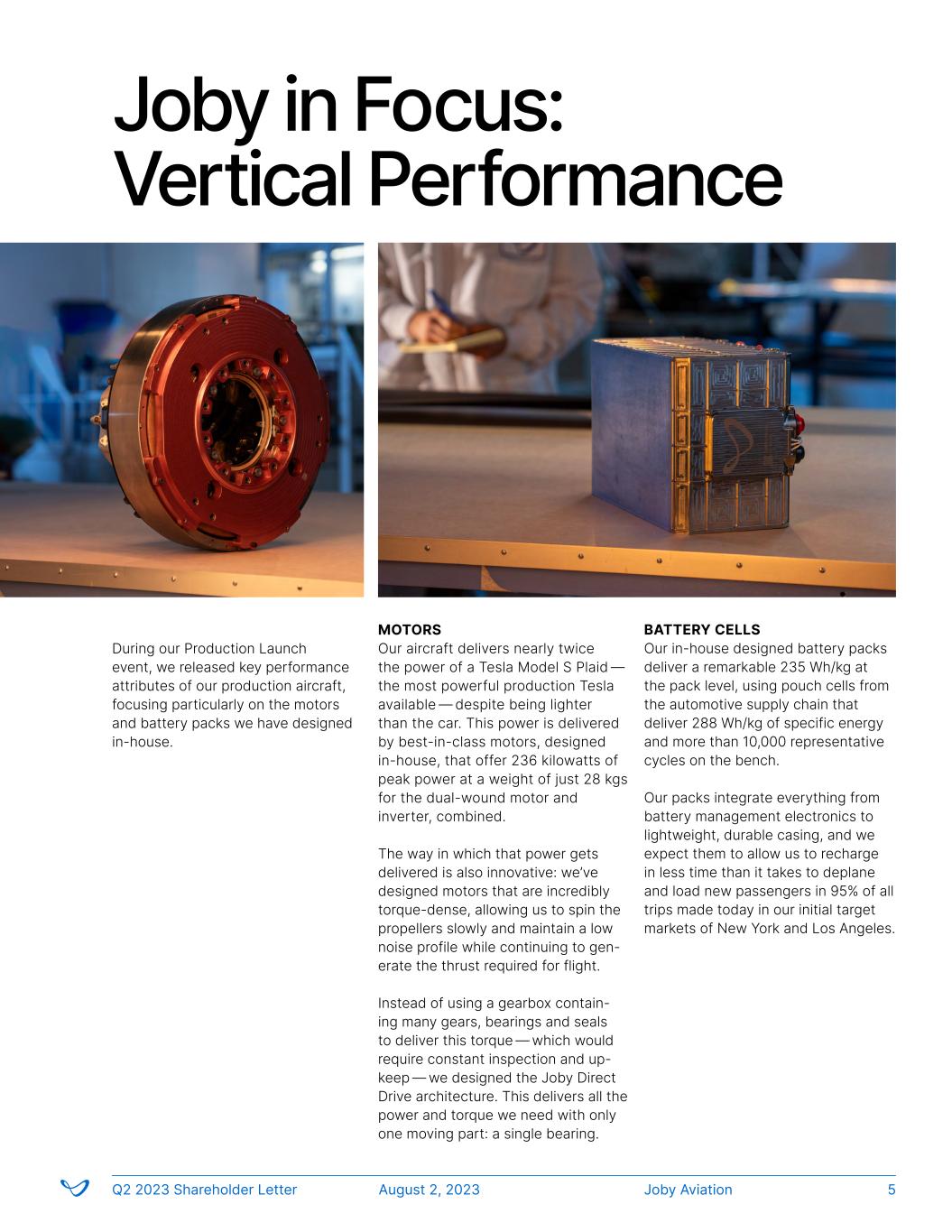 Joby in Focus: Vertical Performance During our Production Launch event, we released key performance attributes of our production aircraft, focusing particularly on the motors and battery packs we have designed in-house. MOTORS Our aircraft delivers nearly twice the power of a Tesla Model S Plaid — the most powerful production Tesla available — despite being lighter than the car. This power is delivered by best-in-class motors, designed in-house, that offer 236 kilowatts of peak power at a weight of just 28 kgs for the dual-wound motor and inverter, combined. The way in which that power gets delivered is also innovative: we’ve designed motors that are incredibly torque-dense, allowing us to spin the propellers slowly and maintain a low noise profile while continuing to gen- erate the thrust required for flight. Instead of using a gearbox contain- ing many gears, bearings and seals to deliver this torque — which would require constant inspection and up- keep — we designed the Joby Direct Drive architecture. This delivers all the power and torque we need with only one moving part: a single bearing. BATTERY CELLS Our in-house designed battery packs deliver a remarkable 235 Wh/kg at the pack level, using pouch cells from the automotive supply chain that deliver 288 Wh/kg of specific energy and more than 10,000 representative cycles on the bench. Our packs integrate everything from battery management electronics to lightweight, durable casing, and we expect them to allow us to recharge in less time than it takes to deplane and load new passengers in 95% of all trips made today in our initial target markets of New York and Los Angeles. Joby AviationQ2 2023 Shareholder Letter August 2, 2023 5