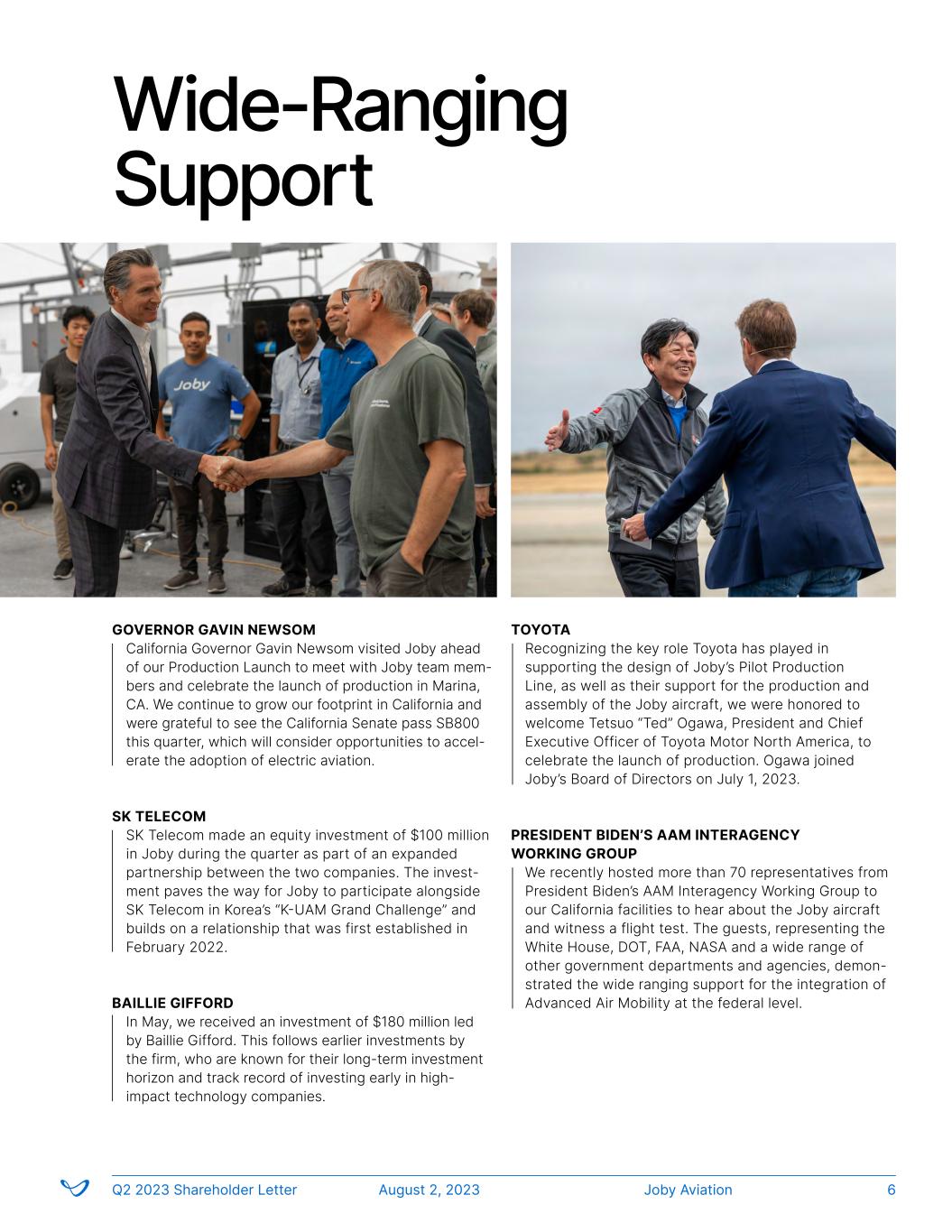 GOVERNOR GAVIN NEWSOM California Governor Gavin Newsom visited Joby ahead of our Production Launch to meet with Joby team mem- bers and celebrate the launch of production in Marina, CA. We continue to grow our footprint in California and were grateful to see the California Senate pass SB800 this quarter, which will consider opportunities to accel- erate the adoption of electric aviation. SK TELECOM SK Telecom made an equity investment of $100 million in Joby during the quarter as part of an expanded partnership between the two companies. The invest- ment paves the way for Joby to participate alongside SK Telecom in Korea’s “K-UAM Grand Challenge” and builds on a relationship that was first established in February 2022. BAILLIE GIFFORD In May, we received an investment of $180 million led by Baillie Gifford. This follows earlier investments by the firm, who are known for their long-term investment horizon and track record of investing early in high- impact technology companies. TOYOTA Recognizing the key role Toyota has played in supporting the design of Joby’s Pilot Production Line, as well as their support for the production and assembly of the Joby aircraft, we were honored to welcome Tetsuo “Ted” Ogawa, President and Chief Executive Officer of Toyota Motor North America, to celebrate the launch of production. Ogawa joined Joby’s Board of Directors on July 1, 2023. PRESIDENT BIDEN’S AAM INTERAGENCY WORKING GROUP We recently hosted more than 70 representatives from President Biden’s AAM Interagency Working Group to our California facilities to hear about the Joby aircraft and witness a flight test. The guests, representing the White House, DOT, FAA, NASA and a wide range of other government departments and agencies, demon- strated the wide ranging support for the integration of Advanced Air Mobility at the federal level. Wide-Ranging Support Joby AviationQ2 2023 Shareholder Letter August 2, 2023 6