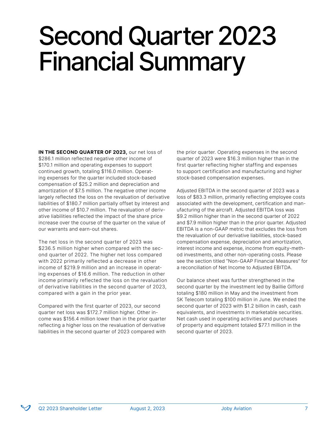 Second Quarter 2023 Financial Summary IN THE SECOND QUARTER OF 2023, our net loss of $286.1 million reflected negative other income of $170.1 million and operating expenses to support continued growth, totaling $116.0 million. Operat- ing expenses for the quarter included stock-based compensation of $25.2 million and depreciation and amortization of $7.5 million. The negative other income largely reflected the loss on the revaluation of derivative liabilities of $180.7 million partially offset by interest and other income of $10.7 million. The revaluation of deriv- ative liabilities reflected the impact of the share price increase over the course of the quarter on the value of our warrants and earn-out shares. The net loss in the second quarter of 2023 was $236.5 million higher when compared with the sec- ond quarter of 2022. The higher net loss compared with 2022 primarily reflected a decrease in other income of $219.9 million and an increase in operat- ing expenses of $16.6 million. The reduction in other income primarily reflected the loss on the revaluation of derivative liabilities in the second quarter of 2023, compared with a gain in the prior year. Compared with the first quarter of 2023, our second quarter net loss was $172.7 million higher. Other in- come was $156.4 million lower than in the prior quarter reflecting a higher loss on the revaluation of derivative liabilities in the second quarter of 2023 compared with the prior quarter. Operating expenses in the second quarter of 2023 were $16.3 million higher than in the first quarter reflecting higher staffing and expenses to support certification and manufacturing and higher stock-based compensation expenses. Adjusted EBITDA in the second quarter of 2023 was a loss of $83.3 million, primarily reflecting employee costs associated with the development, certification and man- ufacturing of the aircraft. Adjusted EBITDA loss was $9.2 million higher than in the second quarter of 2022 and $7.9 million higher than in the prior quarter. Adjusted EBITDA is a non-GAAP metric that excludes the loss from the revaluation of our derivative liabilities, stock-based compensation expense, depreciation and amortization, interest income and expense, income from equity-meth- od investments, and other non-operating costs. Please see the section titled “Non-GAAP Financial Measures” for a reconciliation of Net Income to Adjusted EBITDA. Our balance sheet was further strengthened in the second quarter by the investment led by Baillie Gifford totaling $180 million in May and the investment from SK Telecom totaling $100 million in June. We ended the second quarter of 2023 with $1.2 billion in cash, cash equivalents, and investments in marketable securities. Net cash used in operating activities and purchases of property and equipment totaled $77.1 million in the second quarter of 2023. Joby AviationQ2 2023 Shareholder Letter August 2, 2023 7