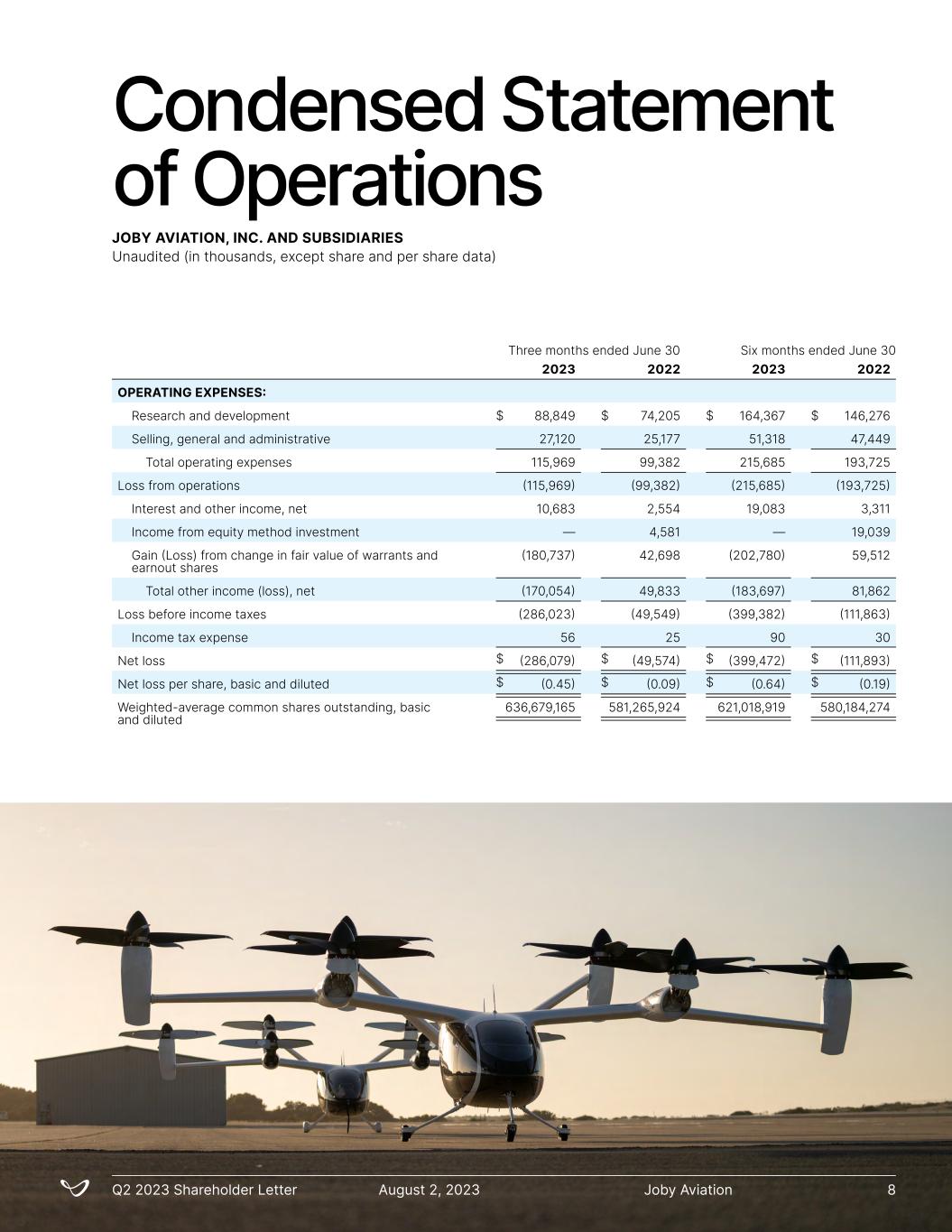 Condensed Statement of Operations JOBY AVIATION, INC. AND SUBSIDIARIES Unaudited (in thousands, except share and per share data) 2023 2022 2023 2022 OPERATING EXPENSES: Research and development 88,849 74,205 164,367 146,276 Selling, general and administrative 27,120 25,177 51,318 47,449 Total operating expenses 115,969 99,382 215,685 193,725 Loss from operations (115,969) (99,382) (215,685) (193,725) Interest and other income, net 10,683 2,554 19,083 3,311 Income from equity method investment — 4,581 — 19,039 Gain (Loss) from change in fair value of warrants and earnout shares (180,737) 42,698 (202,780) 59,512 Total other income (loss), net (170,054) 49,833 (183,697) 81,862 Loss before income taxes (286,023) (49,549) (399,382) (111,863) Income tax expense 56 25 90 30 Net loss (286,079) (49,574) (399,472) (111,893) Net loss per share, basic and diluted (0.45) (0.09) (0.64) (0.19) Weighted-average common shares outstanding, basic and diluted 636,679,165 581,265,924 621,018,919 580,184,274 Three months ended June 30 Six months ended June 30 $ $ $ $ $ $ $ $ $ $ $ $ Joby AviationQ2 2023 Shareholder Letter August 2, 2023 8