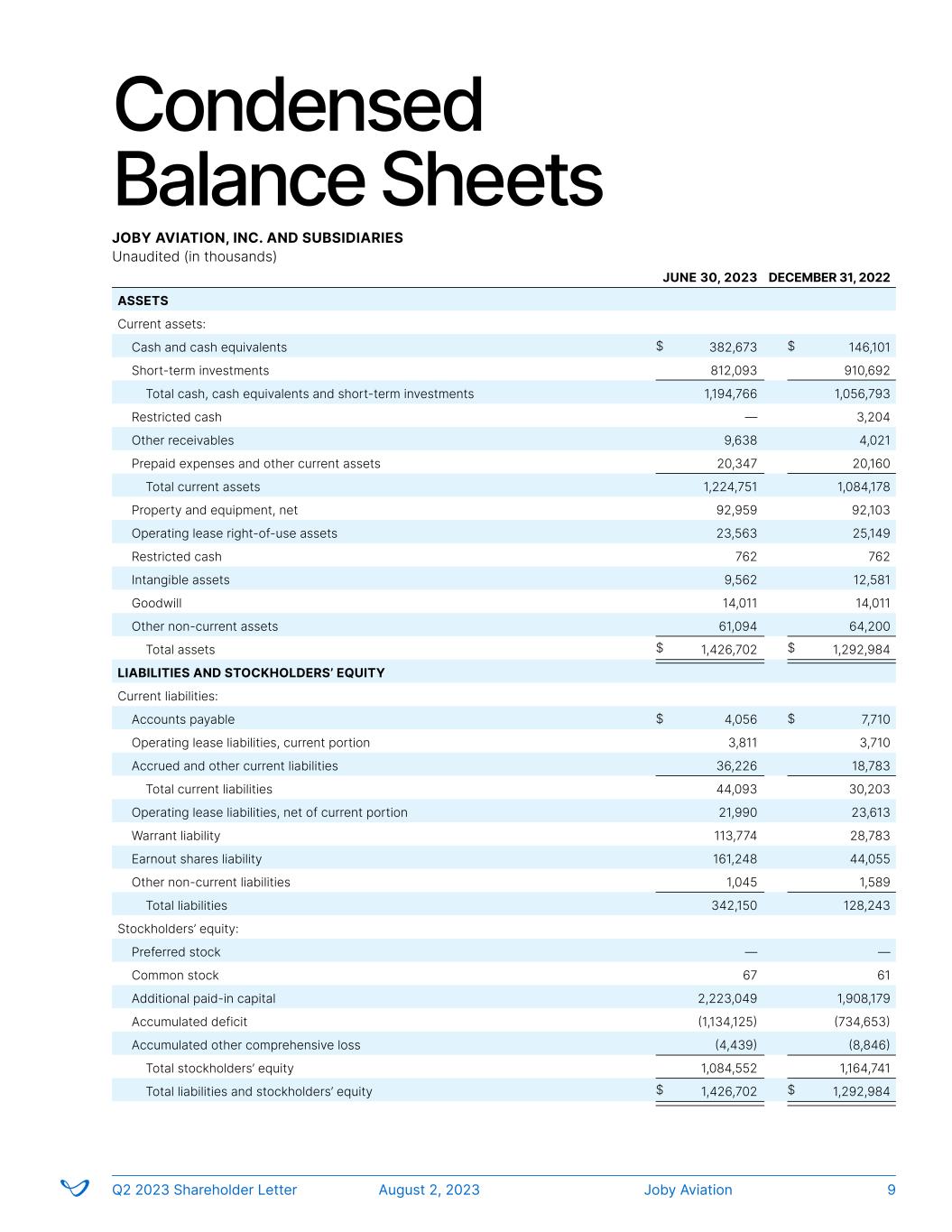 Condensed Balance Sheets JOBY AVIATION, INC. AND SUBSIDIARIES Unaudited (in thousands) JUNE 30, 2023 DECEMBER 31, 2022 ASSETS Current assets: Cash and cash equivalents 382,673 146,101 Short-term investments 812,093 910,692 Total cash, cash equivalents and short-term investments 1,194,766 1,056,793 Restricted cash — 3,204 Other receivables 9,638 4,021 Prepaid expenses and other current assets 20,347 20,160 Total current assets 1,224,751 1,084,178 Property and equipment, net 92,959 92,103 Operating lease right-of-use assets 23,563 25,149 Restricted cash 762 762 Intangible assets 9,562 12,581 Goodwill 14,011 14,011 Other non-current assets 61,094 64,200 Total assets 1,426,702 1,292,984 LIABILITIES AND STOCKHOLDERS’ EQUITY Current liabilities: Accounts payable 4,056 7,710 Operating lease liabilities, current portion 3,811 3,710 Accrued and other current liabilities 36,226 18,783 Total current liabilities 44,093 30,203 Operating lease liabilities, net of current portion 21,990 23,613 Warrant liability 113,774 28,783 Earnout shares liability 161,248 44,055 Other non-current liabilities 1,045 1,589 Total liabilities 342,150 128,243 Stockholders’ equity: Preferred stock — — Common stock 67 61 Additional paid-in capital 2,223,049 1,908,179 Accumulated deficit (1,134,125) (734,653) Accumulated other comprehensive loss (4,439) (8,846) Total stockholders’ equity 1,084,552 1,164,741 Total liabilities and stockholders’ equity 1,426,702 1,292,984 $ $ $ $ $ $ $ $ Joby AviationQ2 2023 Shareholder Letter August 2, 2023 9