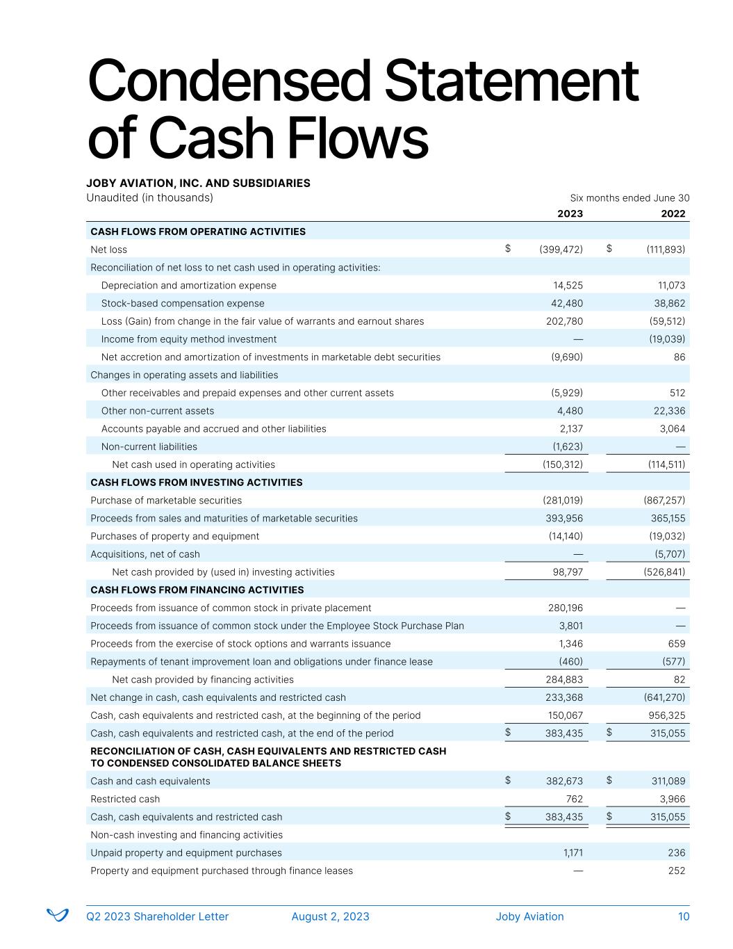 Condensed Statement of Cash Flows JOBY AVIATION, INC. AND SUBSIDIARIES Unaudited (in thousands) 2023 2022 CASH FLOWS FROM OPERATING ACTIVITIES Net loss (399,472) (111,893) Reconciliation of net loss to net cash used in operating activities: Depreciation and amortization expense 14,525 11,073 Stock-based compensation expense 42,480 38,862 Loss (Gain) from change in the fair value of warrants and earnout shares 202,780 (59,512) Income from equity method investment — (19,039) Net accretion and amortization of investments in marketable debt securities (9,690) 86 Changes in operating assets and liabilities Other receivables and prepaid expenses and other current assets (5,929) 512 Other non-current assets 4,480 22,336 Accounts payable and accrued and other liabilities 2,137 3,064 Non-current liabilities (1,623) — Net cash used in operating activities (150,312) (114,511) CASH FLOWS FROM INVESTING ACTIVITIES Purchase of marketable securities (281,019) (867,257) Proceeds from sales and maturities of marketable securities 393,956 365,155 Purchases of property and equipment (14,140) (19,032) Acquisitions, net of cash — (5,707) Net cash provided by (used in) investing activities 98,797 (526,841) CASH FLOWS FROM FINANCING ACTIVITIES Proceeds from issuance of common stock in private placement 280,196 — Proceeds from issuance of common stock under the Employee Stock Purchase Plan 3,801 — Proceeds from the exercise of stock options and warrants issuance 1,346 659 Repayments of tenant improvement loan and obligations under finance lease (460) (577) Net cash provided by financing activities 284,883 82 Net change in cash, cash equivalents and restricted cash 233,368 (641,270) Cash, cash equivalents and restricted cash, at the beginning of the period 150,067 956,325 Cash, cash equivalents and restricted cash, at the end of the period 383,435 315,055 RECONCILIATION OF CASH, CASH EQUIVALENTS AND RESTRICTED CASH TO CONDENSED CONSOLIDATED BALANCE SHEETS Cash and cash equivalents 382,673 311,089 Restricted cash 762 3,966 Cash, cash equivalents and restricted cash 383,435 315,055 Non-cash investing and financing activities Unpaid property and equipment purchases 1,171 236 Property and equipment purchased through finance leases — 252 $ $ $ $ $ $ $ $ Joby AviationQ2 2023 Shareholder Letter August 2, 2023 10 Six months ended June 30