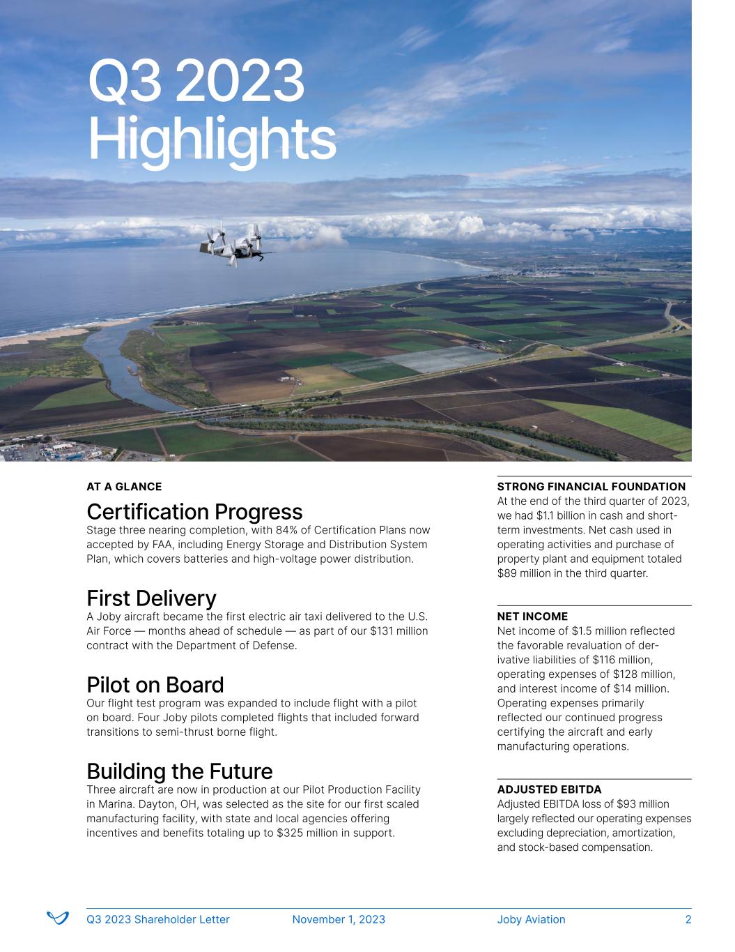 AT A GLANCE Certification Progress Stage three nearing completion, with 84% of Certification Plans now accepted by FAA, including Energy Storage and Distribution System Plan, which covers batteries and high-voltage power distribution. First Delivery A Joby aircraft became the first electric air taxi delivered to the U.S. Air Force — months ahead of schedule — as part of our $131 million contract with the Department of Defense. Pilot on Board Our flight test program was expanded to include flight with a pilot on board. Four Joby pilots completed flights that included forward transitions to semi-thrust borne flight. Building the Future Three aircraft are now in production at our Pilot Production Facility in Marina. Dayton, OH, was selected as the site for our first scaled manufacturing facility, with state and local agencies offering incentives and benefits totaling up to $325 million in support. STRONG FINANCIAL FOUNDATION At the end of the third quarter of 2023, we had $1.1 billion in cash and short- term investments. Net cash used in operating activities and purchase of property plant and equipment totaled $89 million in the third quarter. NET INCOME Net income of $1.5 million reflected the favorable revaluation of der- ivative liabilities of $116 million, operating expenses of $128 million, and interest income of $14 million. Operating expenses primarily reflected our continued progress certifying the aircraft and early manufacturing operations. ADJUSTED EBITDA Adjusted EBITDA loss of $93 million largely reflected our operating expenses excluding depreciation, amortization, and stock-based compensation. Q3 2023 Highlights Joby AviationQ3 2023 Shareholder Letter November 1, 2023 2