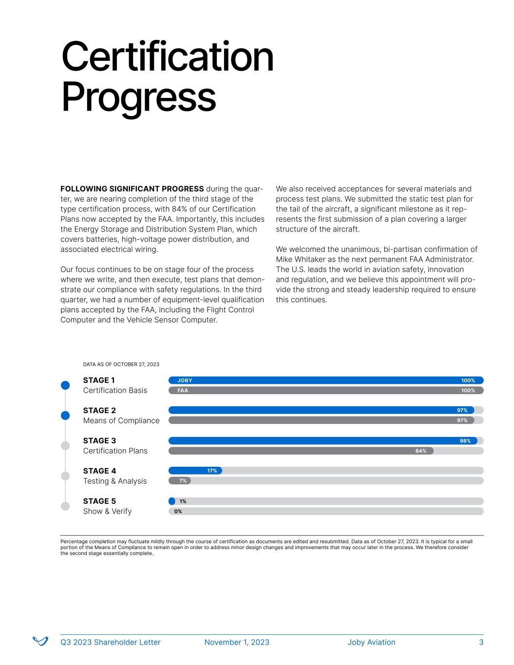 Certification Progress FOLLOWING SIGNIFICANT PROGRESS during the quar- ter, we are nearing completion of the third stage of the type certification process, with 84% of our Certification Plans now accepted by the FAA. Importantly, this includes the Energy Storage and Distribution System Plan, which covers batteries, high-voltage power distribution, and associated electrical wiring. Our focus continues to be on stage four of the process where we write, and then execute, test plans that demon- strate our compliance with safety regulations. In the third quarter, we had a number of equipment-level qualification plans accepted by the FAA, including the Flight Control Computer and the Vehicle Sensor Computer. We also received acceptances for several materials and process test plans. We submitted the static test plan for the tail of the aircraft, a significant milestone as it rep- resents the first submission of a plan covering a larger structure of the aircraft. We welcomed the unanimous, bi-partisan confirmation of Mike Whitaker as the next permanent FAA Administrator. The U.S. leads the world in aviation safety, innovation and regulation, and we believe this appointment will pro- vide the strong and steady leadership required to ensure this continues. Percentage completion may fluctuate mildly through the course of certification as documents are edited and resubmitted. Data as of October 27, 2023. It is typical for a small portion of the Means of Compliance to remain open in order to address minor design changes and improvements that may occur later in the process. We therefore consider the second stage essentially complete. Joby’s Progress to Type Certification STAGE 1 Certification Basis STAGE 2 Means of Compliance STAGE 3 Certification Plans STAGE 4 Testing & Analysis STAGE 5 Show & Verify JOBY 100% 97% 98% 17% 1% FAA 100% 97% 84% 7% 0% DATA AS OF OCTOBER 27, 2023 Joby AviationQ3 2023 Shareholder Letter November 1, 2023 3