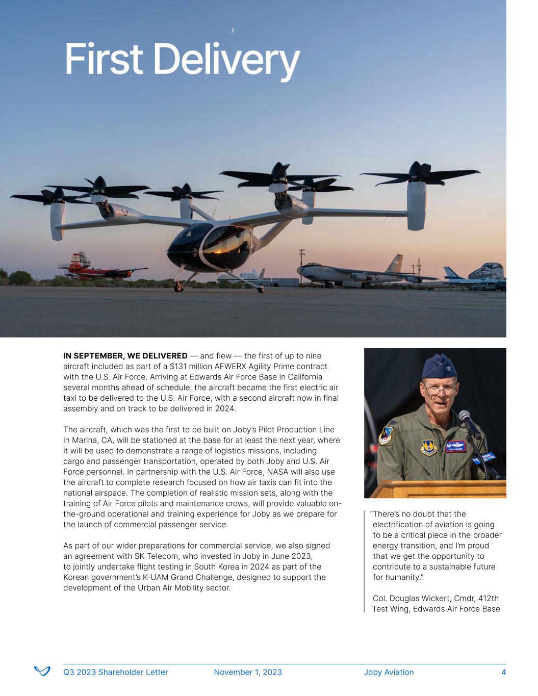 IN SEPTEMBER, WE DELIVERED — and flew — the first of up to nine aircraft included as part of a $131 million AFWERX Agility Prime contract with the U.S. Air Force. Arriving at Edwards Air Force Base in California several months ahead of schedule, the aircraft became the first electric air taxi to be delivered to the U.S. Air Force, with a second aircraft now in final assembly and on track to be delivered in 2024. The aircraft, which was the first to be built on Joby’s Pilot Production Line in Marina, CA, will be stationed at the base for at least the next year, where it will be used to demonstrate a range of logistics missions, including cargo and passenger transportation, operated by both Joby and U.S. Air Force personnel. In partnership with the U.S. Air Force, NASA will also use the aircraft to complete research focused on how air taxis can fit into the national airspace. The completion of realistic mission sets, along with the training of Air Force pilots and maintenance crews, will provide valuable on- the-ground operational and training experience for Joby as we prepare for the launch of commercial passenger service. As part of our wider preparations for commercial service, we also signed an agreement with SK Telecom, who invested in Joby in June 2023, to jointly undertake flight testing in South Korea in 2024 as part of the Korean government’s K-UAM Grand Challenge, designed to support the development of the Urban Air Mobility sector. “There’s no doubt that the electrification of aviation is going to be a critical piece in the broader energy transition, and I’m proud that we get the opportunity to contribute to a sustainable future for humanity.” Col. Douglas Wickert, Cmdr, 412th Test Wing, Edwards Air Force Base First Delivery Joby AviationQ3 2023 Shareholder Letter November 1, 2023 4