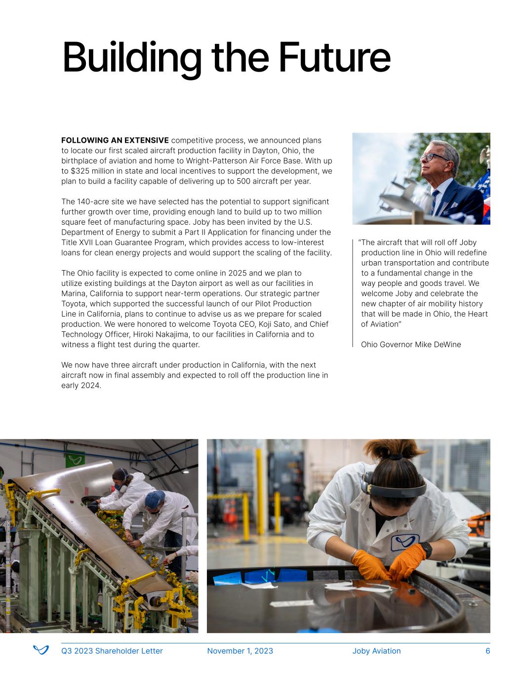 FOLLOWING AN EXTENSIVE competitive process, we announced plans to locate our first scaled aircraft production facility in Dayton, Ohio, the birthplace of aviation and home to Wright-Patterson Air Force Base. With up to $325 million in state and local incentives to support the development, we plan to build a facility capable of delivering up to 500 aircraft per year. The 140-acre site we have selected has the potential to support significant further growth over time, providing enough land to build up to two million square feet of manufacturing space. Joby has been invited by the U.S. Department of Energy to submit a Part II Application for financing under the Title XVII Loan Guarantee Program, which provides access to low-interest loans for clean energy projects and would support the scaling of the facility. The Ohio facility is expected to come online in 2025 and we plan to utilize existing buildings at the Dayton airport as well as our facilities in Marina, California to support near-term operations. Our strategic partner Toyota, which supported the successful launch of our Pilot Production Line in California, plans to continue to advise us as we prepare for scaled production. We were honored to welcome Toyota CEO, Koji Sato, and Chief Technology Officer, Hiroki Nakajima, to our facilities in California and to witness a flight test during the quarter. We now have three aircraft under production in California, with the next aircraft now in final assembly and expected to roll off the production line in early 2024. “The aircraft that will roll off Joby production line in Ohio will redefine urban transportation and contribute to a fundamental change in the way people and goods travel. We welcome Joby and celebrate the new chapter of air mobility history that will be made in Ohio, the Heart of Aviation” Ohio Governor Mike DeWine Building the Future Joby AviationQ3 2023 Shareholder Letter November 1, 2023 6