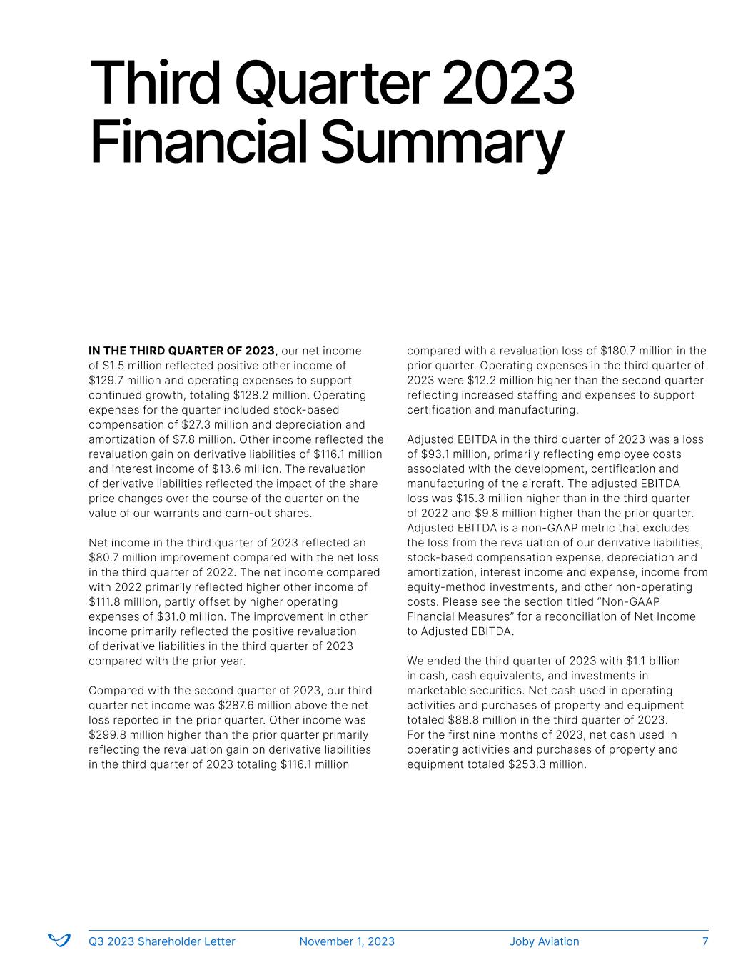 Third Quarter 2023 Financial Summary IN THE THIRD QUARTER OF 2023, our net income of $1.5 million reflected positive other income of $129.7 million and operating expenses to support continued growth, totaling $128.2 million. Operating expenses for the quarter included stock-based compensation of $27.3 million and depreciation and amortization of $7.8 million. Other income reflected the revaluation gain on derivative liabilities of $116.1 million and interest income of $13.6 million. The revaluation of derivative liabilities reflected the impact of the share price changes over the course of the quarter on the value of our warrants and earn-out shares. Net income in the third quarter of 2023 reflected an $80.7 million improvement compared with the net loss in the third quarter of 2022. The net income compared with 2022 primarily reflected higher other income of $111.8 million, partly offset by higher operating expenses of $31.0 million. The improvement in other income primarily reflected the positive revaluation of derivative liabilities in the third quarter of 2023 compared with the prior year. Compared with the second quarter of 2023, our third quarter net income was $287.6 million above the net loss reported in the prior quarter. Other income was $299.8 million higher than the prior quarter primarily reflecting the revaluation gain on derivative liabilities in the third quarter of 2023 totaling $116.1 million compared with a revaluation loss of $180.7 million in the prior quarter. Operating expenses in the third quarter of 2023 were $12.2 million higher than the second quarter reflecting increased staffing and expenses to support certification and manufacturing. Adjusted EBITDA in the third quarter of 2023 was a loss of $93.1 million, primarily reflecting employee costs associated with the development, certification and manufacturing of the aircraft. The adjusted EBITDA loss was $15.3 million higher than in the third quarter of 2022 and $9.8 million higher than the prior quarter. Adjusted EBITDA is a non-GAAP metric that excludes the loss from the revaluation of our derivative liabilities, stock-based compensation expense, depreciation and amortization, interest income and expense, income from equity-method investments, and other non-operating costs. Please see the section titled “Non-GAAP Financial Measures” for a reconciliation of Net Income to Adjusted EBITDA. We ended the third quarter of 2023 with $1.1 billion in cash, cash equivalents, and investments in marketable securities. Net cash used in operating activities and purchases of property and equipment totaled $88.8 million in the third quarter of 2023. For the first nine months of 2023, net cash used in operating activities and purchases of property and equipment totaled $253.3 million. Joby AviationQ3 2023 Shareholder Letter November 1, 2023 7