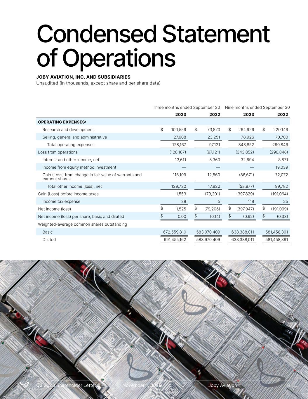 Condensed Statement of Operations JOBY AVIATION, INC. AND SUBSIDIARIES Unaudited (in thousands, except share and per share data) 2023 2022 2023 2022 OPERATING EXPENSES: Research and development 100,559 73,870 264,926 220,146 Selling, general and administrative 27,608 23,251 78,926 70,700 Total operating expenses 128,167 97,121 343,852 290,846 Loss from operations (128,167) (97,121) (343,852) (290,846) Interest and other income, net 13,611 5,360 32,694 8,671 Income from equity method investment — — — 19,039 Gain (Loss) from change in fair value of warrants and earnout shares 116,109 12,560 (86,671) 72,072 Total other income (loss), net 129,720 17,920 (53,977) 99,782 Gain (Loss) before income taxes 1,553 (79,201) (397,829) (191,064) Income tax expense 28 5 118 35 Net income (loss) 1,525 (79,206) (397,947) (191,099) Net income (loss) per share, basic and diluted 0.00 (0.14) (0.62) (0.33) Weighted-average common shares outstanding Basic 672,559,810 583,970,409 638,388,011 581,458,391 Diluted 691,455,162 583,970,409 638,388,011 581,458,391 Three months ended September 30 Nine months ended September 30 $ $ $ $ $ $ $ $ $ $ $ $ Joby AviationQ3 2023 Shareholder Letter November 1, 2023 8