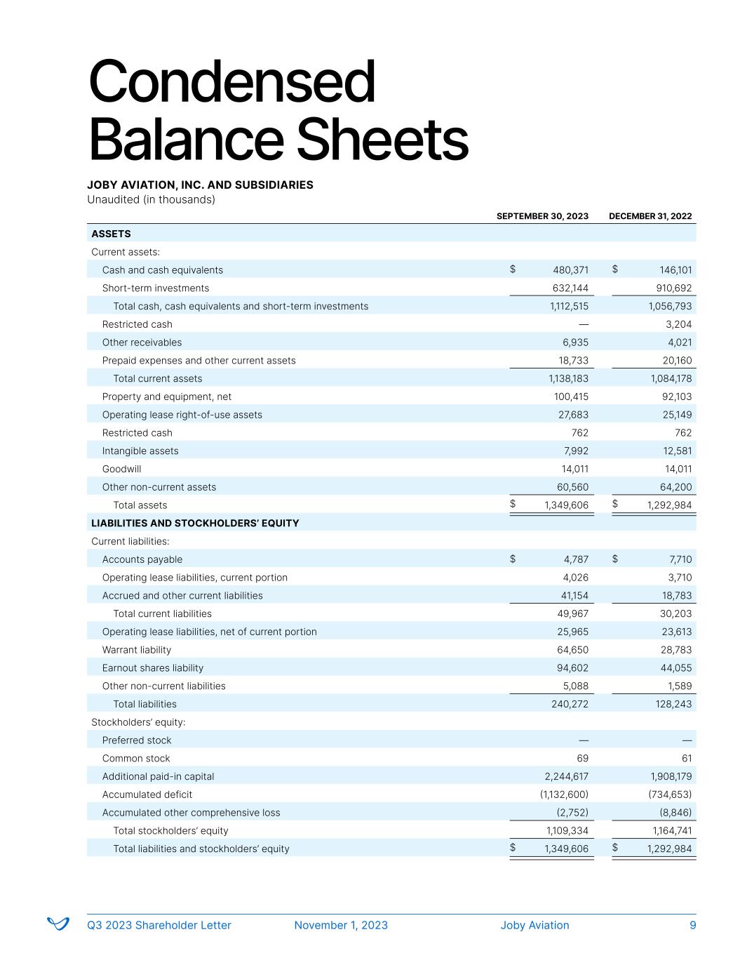 Condensed Balance Sheets JOBY AVIATION, INC. AND SUBSIDIARIES Unaudited (in thousands) SEPTEMBER 30, 2023 DECEMBER 31, 2022 ASSETS Current assets: Cash and cash equivalents 480,371 146,101 Short-term investments 632,144 910,692 Total cash, cash equivalents and short-term investments 1,112,515 1,056,793 Restricted cash — 3,204 Other receivables 6,935 4,021 Prepaid expenses and other current assets 18,733 20,160 Total current assets 1,138,183 1,084,178 Property and equipment, net 100,415 92,103 Operating lease right-of-use assets 27,683 25,149 Restricted cash 762 762 Intangible assets 7,992 12,581 Goodwill 14,011 14,011 Other non-current assets 60,560 64,200 Total assets 1,349,606 1,292,984 LIABILITIES AND STOCKHOLDERS’ EQUITY Current liabilities: Accounts payable 4,787 7,710 Operating lease liabilities, current portion 4,026 3,710 Accrued and other current liabilities 41,154 18,783 Total current liabilities 49,967 30,203 Operating lease liabilities, net of current portion 25,965 23,613 Warrant liability 64,650 28,783 Earnout shares liability 94,602 44,055 Other non-current liabilities 5,088 1,589 Total liabilities 240,272 128,243 Stockholders’ equity: Preferred stock — — Common stock 69 61 Additional paid-in capital 2,244,617 1,908,179 Accumulated deficit (1,132,600) (734,653) Accumulated other comprehensive loss (2,752) (8,846) Total stockholders’ equity 1,109,334 1,164,741 Total liabilities and stockholders’ equity 1,349,606 1,292,984 $ $ $ $ $ $ $ $ Joby AviationQ3 2023 Shareholder Letter November 1, 2023 9
