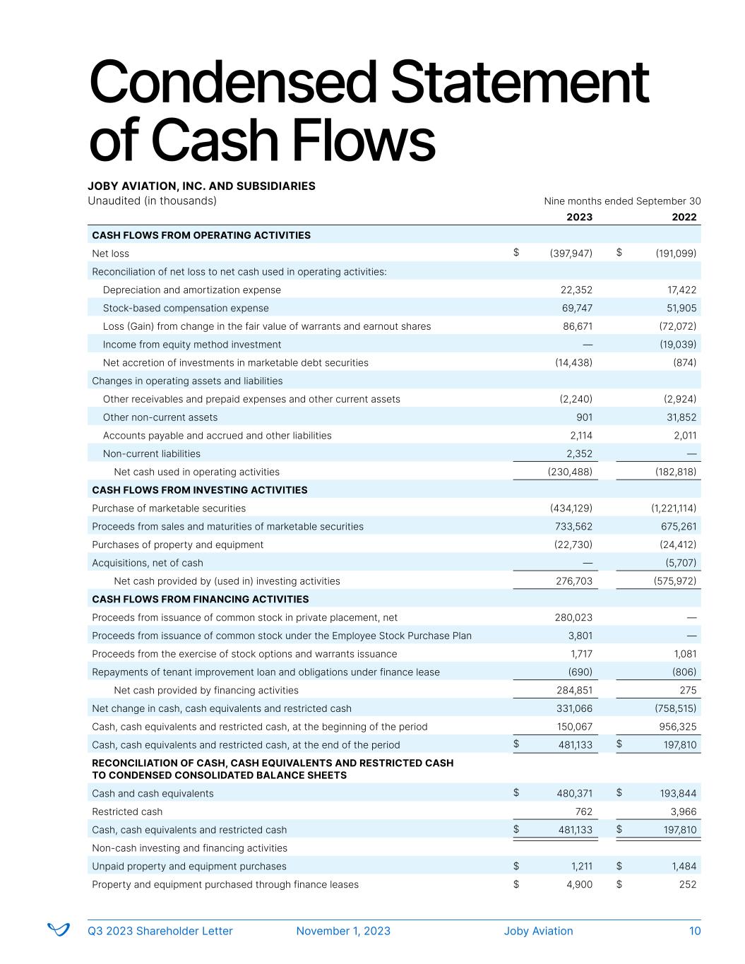 Condensed Statement of Cash Flows JOBY AVIATION, INC. AND SUBSIDIARIES Unaudited (in thousands) 2023 2022 CASH FLOWS FROM OPERATING ACTIVITIES Net loss (397,947) (191,099) Reconciliation of net loss to net cash used in operating activities: Depreciation and amortization expense 22,352 17,422 Stock-based compensation expense 69,747 51,905 Loss (Gain) from change in the fair value of warrants and earnout shares 86,671 (72,072) Income from equity method investment — (19,039) Net accretion of investments in marketable debt securities (14,438) (874) Changes in operating assets and liabilities Other receivables and prepaid expenses and other current assets (2,240) (2,924) Other non-current assets 901 31,852 Accounts payable and accrued and other liabilities 2,114 2,011 Non-current liabilities 2,352 — Net cash used in operating activities (230,488) (182,818) CASH FLOWS FROM INVESTING ACTIVITIES Purchase of marketable securities (434,129) (1,221,114) Proceeds from sales and maturities of marketable securities 733,562 675,261 Purchases of property and equipment (22,730) (24,412) Acquisitions, net of cash — (5,707) Net cash provided by (used in) investing activities 276,703 (575,972) CASH FLOWS FROM FINANCING ACTIVITIES Proceeds from issuance of common stock in private placement, net 280,023 — Proceeds from issuance of common stock under the Employee Stock Purchase Plan 3,801 — Proceeds from the exercise of stock options and warrants issuance 1,717 1,081 Repayments of tenant improvement loan and obligations under finance lease (690) (806) Net cash provided by financing activities 284,851 275 Net change in cash, cash equivalents and restricted cash 331,066 (758,515) Cash, cash equivalents and restricted cash, at the beginning of the period 150,067 956,325 Cash, cash equivalents and restricted cash, at the end of the period 481,133 197,810 RECONCILIATION OF CASH, CASH EQUIVALENTS AND RESTRICTED CASH TO CONDENSED CONSOLIDATED BALANCE SHEETS Cash and cash equivalents 480,371 193,844 Restricted cash 762 3,966 Cash, cash equivalents and restricted cash 481,133 197,810 Non-cash investing and financing activities Unpaid property and equipment purchases 1,211 1,484 Property and equipment purchased through finance leases 4,900 252 $ $ $ $ $ $ $ $ $ $ $ $ Nine months ended September 30 Joby AviationQ3 2023 Shareholder Letter November 1, 2023 10