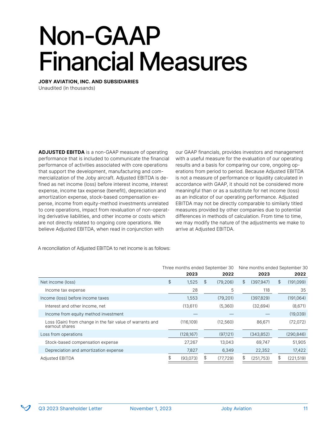 Non-GAAP Financial Measures ADJUSTED EBITDA is a non-GAAP measure of operating performance that is included to communicate the financial performance of activities associated with core operations that support the development, manufacturing and com- mercialization of the Joby aircraft. Adjusted EBITDA is de- fined as net income (loss) before interest income, interest expense, income tax expense (benefit), depreciation and amortization expense, stock-based compensation ex- pense, income from equity-method investments unrelated to core operations, impact from revaluation of non-operat- ing derivative liabilities, and other income or costs which are not directly related to ongoing core operations. We believe Adjusted EBITDA, when read in conjunction with our GAAP financials, provides investors and management with a useful measure for the evaluation of our operating results and a basis for comparing our core, ongoing op- erations from period to period. Because Adjusted EBITDA is not a measure of performance or liquidity calculated in accordance with GAAP, it should not be considered more meaningful than or as a substitute for net income (loss) as an indicator of our operating performance. Adjusted EBITDA may not be directly comparable to similarly titled measures provided by other companies due to potential differences in methods of calculation. From time to time, we may modify the nature of the adjustments we make to arrive at Adjusted EBITDA. A reconciliation of Adjusted EBITDA to net income is as follows: JOBY AVIATION, INC. AND SUBSIDIARIES Unaudited (in thousands) 2023 2022 2023 2022 Net income (loss) 1,525 (79,206) (397,947) (191,099) Income tax expense 28 5 118 35 Income (loss) before income taxes 1,553 (79,201) (397,829) (191,064) Interest and other income, net (13,611) (5,360) (32,694) (8,671) Income from equity method investment — — — (19,039) Loss (Gain) from change in the fair value of warrants and earnout shares (116,109) (12,560) 86,671 (72,072) Loss from operations (128,167) (97,121) (343,852) (290,846) Stock-based compensation expense 27,267 13,043 69,747 51,905 Depreciation and amortization expense 7,827 6,349 22,352 17,422 Adjusted EBITDA (93,073) (77,729) (251,753) (221,519) Three months ended September 30 Nine months ended September 30 $ $$ $ $ $$ $ Joby AviationQ3 2023 Shareholder Letter November 1, 2023 11