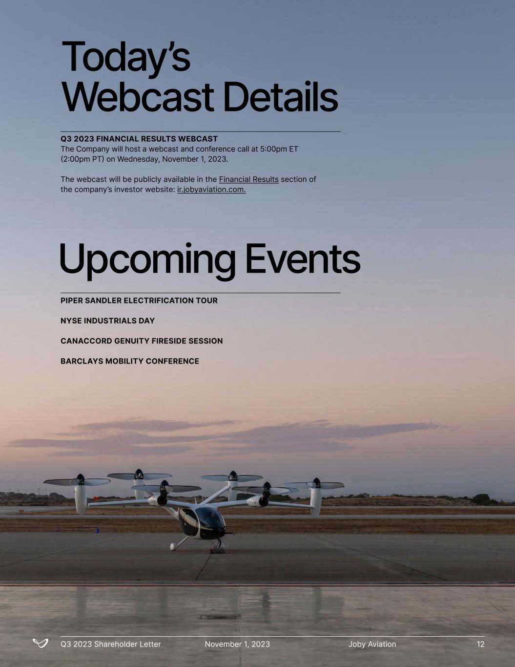 Upcoming Events Today’s Webcast Details Q3 2023 FINANCIAL RESULTS WEBCAST The Company will host a webcast and conference call at 5:00pm ET (2:00pm PT) on Wednesday, November 1, 2023. The webcast will be publicly available in the Financial Results section of the company’s investor website: ir.jobyaviation.com. PIPER SANDLER ELECTRIFICATION TOUR NYSE INDUSTRIALS DAY CANACCORD GENUITY FIRESIDE SESSION BARCLAYS MOBILITY CONFERENCE Joby AviationQ3 2023 Shareholder Letter November 1, 2023 12