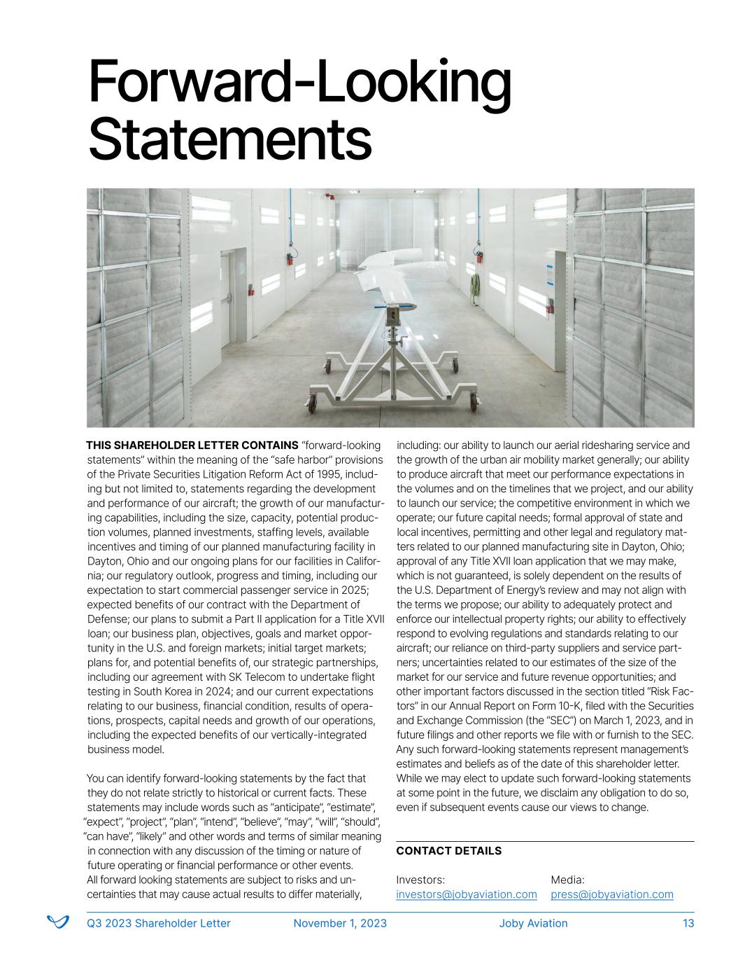 Forward-Looking Statements THIS SHAREHOLDER LETTER CONTAINS “forward-looking statements” within the meaning of the “safe harbor” provisions of the Private Securities Litigation Reform Act of 1995, includ- ing but not limited to, statements regarding the development and performance of our aircraft; the growth of our manufactur- ing capabilities, including the size, capacity, potential produc- tion volumes, planned investments, staffing levels, available incentives and timing of our planned manufacturing facility in Dayton, Ohio and our ongoing plans for our facilities in Califor- nia; our regulatory outlook, progress and timing, including our expectation to start commercial passenger service in 2025; expected benefits of our contract with the Department of Defense; our plans to submit a Part II application for a Title XVII loan; our business plan, objectives, goals and market oppor- tunity in the U.S. and foreign markets; initial target markets; plans for, and potential benefits of, our strategic partnerships, including our agreement with SK Telecom to undertake flight testing in South Korea in 2024; and our current expectations relating to our business, financial condition, results of opera- tions, prospects, capital needs and growth of our operations, including the expected benefits of our vertically-integrated business model. You can identify forward-looking statements by the fact that they do not relate strictly to historical or current facts. These statements may include words such as “anticipate”, “estimate”, “expect”, “project”, “plan”, “intend”, “believe”, “may”, “will”, “should”, “can have”, “likely” and other words and terms of similar meaning in connection with any discussion of the timing or nature of future operating or financial performance or other events. All forward looking statements are subject to risks and un- certainties that may cause actual results to differ materially, including: our ability to launch our aerial ridesharing service and the growth of the urban air mobility market generally; our ability to produce aircraft that meet our performance expectations in the volumes and on the timelines that we project, and our ability to launch our service; the competitive environment in which we operate; our future capital needs; formal approval of state and local incentives, permitting and other legal and regulatory mat- ters related to our planned manufacturing site in Dayton, Ohio; approval of any Title XVII loan application that we may make, which is not guaranteed, is solely dependent on the results of the U.S. Department of Energy’s review and may not align with the terms we propose; our ability to adequately protect and enforce our intellectual property rights; our ability to effectively respond to evolving regulations and standards relating to our aircraft; our reliance on third-party suppliers and service part- ners; uncertainties related to our estimates of the size of the market for our service and future revenue opportunities; and other important factors discussed in the section titled “Risk Fac- tors” in our Annual Report on Form 10-K, filed with the Securities and Exchange Commission (the “SEC”) on March 1, 2023, and in future filings and other reports we file with or furnish to the SEC. Any such forward-looking statements represent management’s estimates and beliefs as of the date of this shareholder letter. While we may elect to update such forward-looking statements at some point in the future, we disclaim any obligation to do so, even if subsequent events cause our views to change. CONTACT DETAILS Investors: investors@jobyaviation.com Media: press@jobyaviation.com Joby AviationQ3 2023 Shareholder Letter November 1, 2023 13