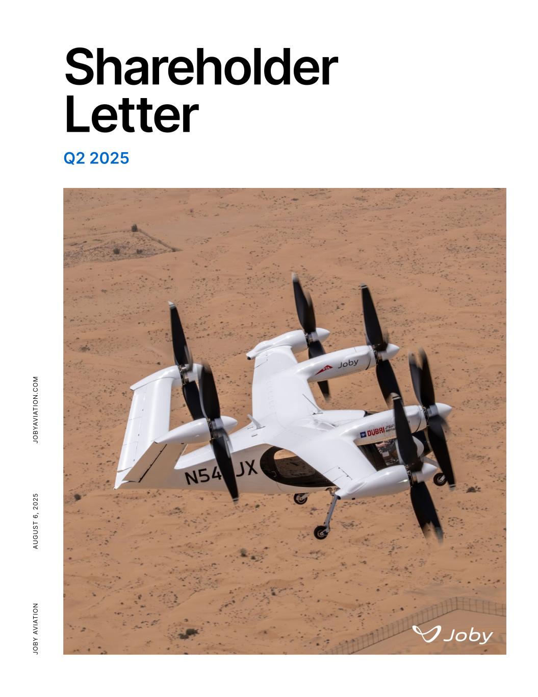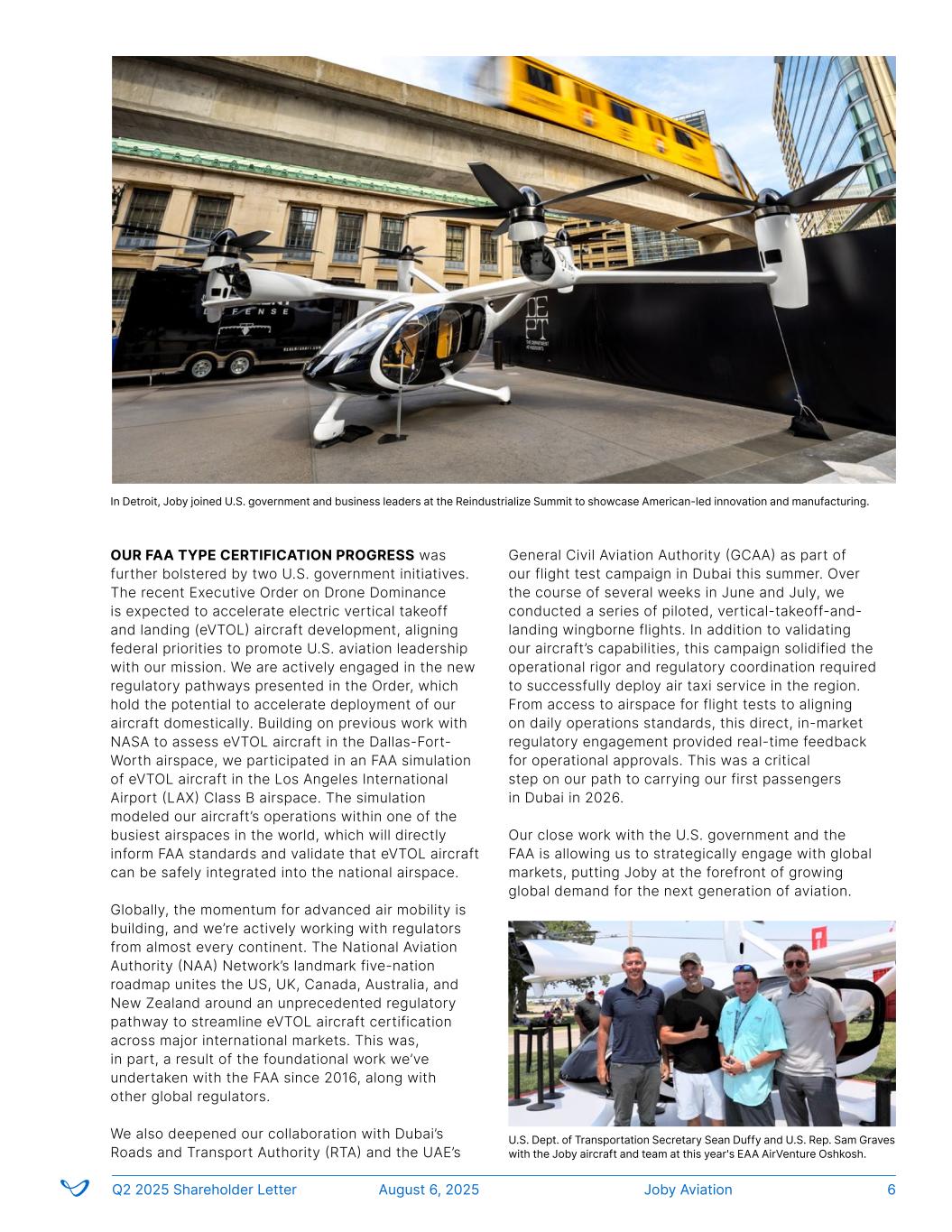 OUR FAA TYPE CERTIFICATION PROGRESS was further bolstered by two U.S. government initiatives. The recent Executive Order on Drone Dominance is expected to accelerate electric vertical takeoff and landing (eVTOL) aircraft development, aligning federal priorities to promote U.S. aviation leadership with our mission. We are actively engaged in the new regulatory pathways presented in the Order, which hold the potential to accelerate deployment of our aircraft domestically. Building on previous work with NASA to assess eVTOL aircraft in the Dallas-Fort- Worth airspace, we participated in an FAA simulation of eVTOL aircraft in the Los Angeles International Airport (LAX) Class B airspace. The simulation modeled our aircraft’s operations within one of the busiest airspaces in the world, which will directly inform FAA standards and validate that eVTOL aircraft can be safely integrated into the national airspace. Globally, the momentum for advanced air mobility is building, and we’re actively working with regulators from almost every continent. The National Aviation Authority (NAA) Network’s landmark five-nation roadmap unites the US, UK, Canada, Australia, and New Zealand around an unprecedented regulatory pathway to streamline eVTOL aircraft certification across major international markets. This was, in part, a result of the foundational work we’ve undertaken with the FAA since 2016, along with other global regulators. We also deepened our collaboration with Dubai’s Roads and Transport Authority (RTA) and the UAE’s General Civil Aviation Authority (GCAA) as part of our flight test campaign in Dubai this summer. Over the course of several weeks in June and July, we conducted a series of piloted, vertical-takeoff-and- landing wingborne flights. In addition to validating our aircraft’s capabilities, this campaign solidified the operational rigor and regulatory coordination required to successfully deploy air taxi service in the region. From access to airspace for flight tests to aligning on daily operations standards, this direct, in-market regulatory engagement provided real-time feedback for operational approvals. This was a critical step on our path to carrying our first passengers in Dubai in 2026. Our close work with the U.S. government and the FAA is allowing us to strategically engage with global markets, putting Joby at the forefront of growing global demand for the next generation of aviation. Joby AviationQ2 2025 Shareholder Letter August 6, 2025 6 U.S. Dept. of Transportation Secretary Sean Duffy and U.S. Rep. Sam Graves with the Joby aircraft and team at this year's EAA AirVenture Oshkosh. In Detroit, Joby joined U.S. government and business leaders at the Reindustrialize Summit to showcase American-led innovation and manufacturing.