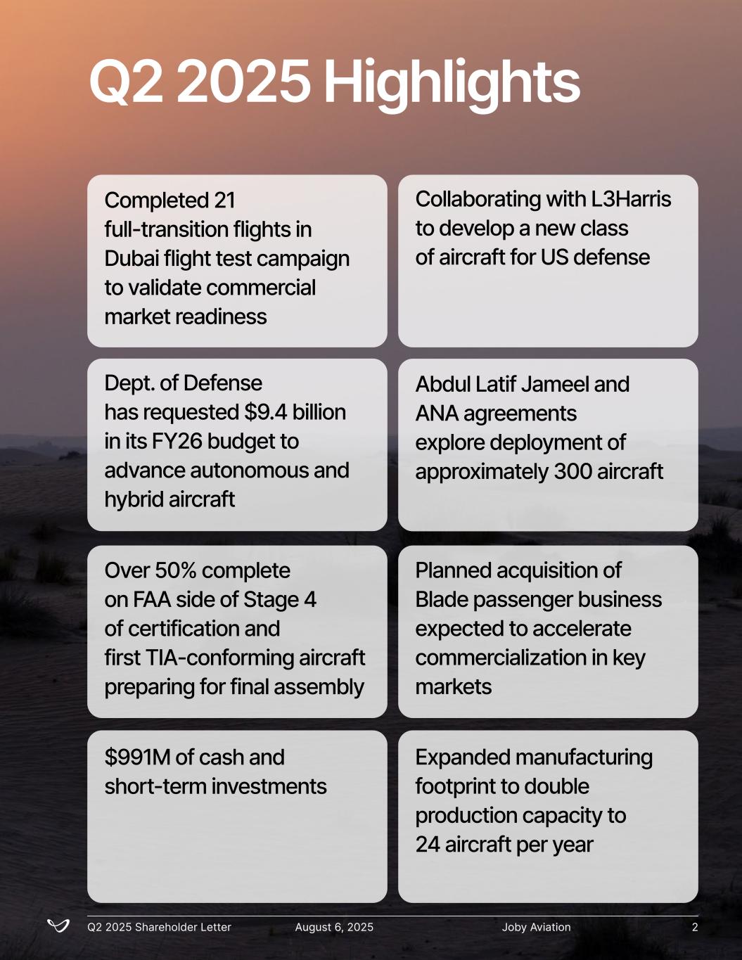 Completed 21 full-transition flights in Dubai flight test campaign to validate commercial market readiness Over 50% complete on FAA side of Stage 4 of certification and first TIA-conforming aircraft preparing for final assembly $991M of cash and short-term investments Collaborating with L3Harris to develop a new class of aircraft for US defense Dept. of Defense has requested $9.4 billion in its FY26 budget to advance autonomous and hybrid aircraft Abdul Latif Jameel and ANA agreements explore deployment of approximately 300 aircraft Planned acquisition of Blade passenger business expected to accelerate commercialization in key markets Expanded manufacturing footprint to double production capacity to 24 aircraft per year Q2 2025 Highlights Joby AviationQ2 2025 Shareholder Letter August 6, 2025 2