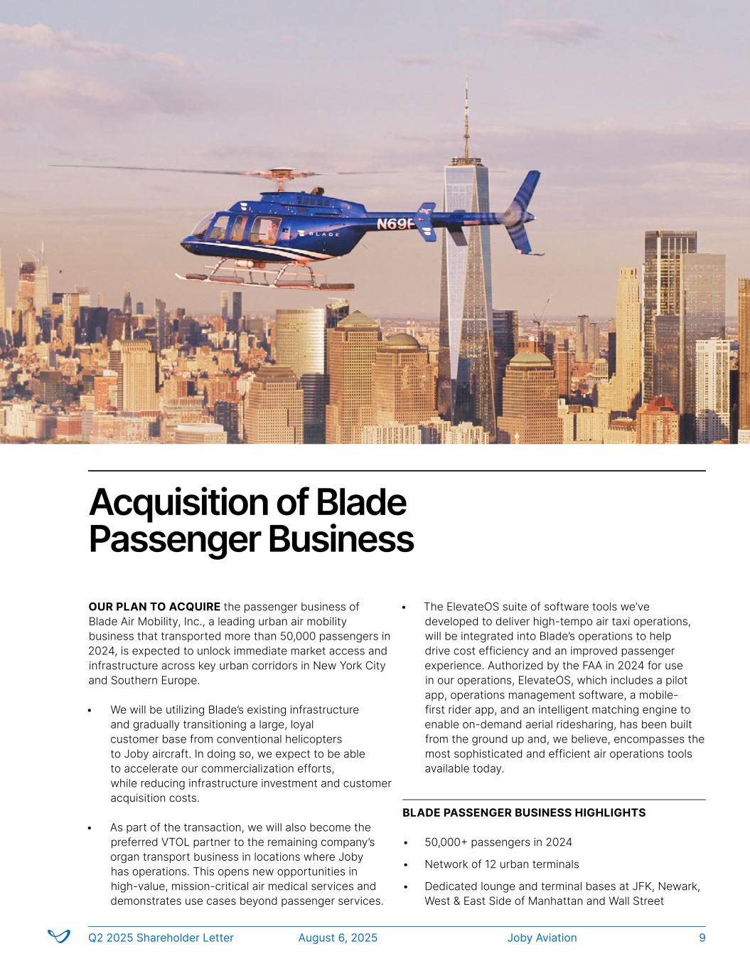 OUR PLAN TO ACQUIRE the passenger business of Blade Air Mobility, Inc., a leading urban air mobility business that transported more than 50,000 passengers in 2024, is expected to unlock immediate market access and infrastructure across key urban corridors in New York City and Southern Europe. • We will be utilizing Blade’s existing infrastructure and gradually transitioning a large, loyal customer base from conventional helicopters to Joby aircraft. In doing so, we expect to be able to accelerate our commercialization efforts, while reducing infrastructure investment and customer acquisition costs. • As part of the transaction, we will also become the preferred VTOL partner to the remaining company’s organ transport business in locations where Joby has operations. This opens new opportunities in high-value, mission-critical air medical services and demonstrates use cases beyond passenger services. • The ElevateOS suite of software tools we’ve developed to deliver high-tempo air taxi operations, will be integrated into Blade’s operations to help drive cost efficiency and an improved passenger experience. Authorized by the FAA in 2024 for use in our operations, ElevateOS, which includes a pilot app, operations management software, a mobile- first rider app, and an intelligent matching engine to enable on-demand aerial ridesharing, has been built from the ground up and, we believe, encompasses the most sophisticated and efficient air operations tools available today. Acquisition of Blade Passenger Business Joby AviationQ2 2025 Shareholder Letter August 6, 2025 9 BLADE PASSENGER BUSINESS HIGHLIGHTS • 50,000+ passengers in 2024 • Network of 12 urban terminals • Dedicated lounge and terminal bases at JFK, Newark, West & East Side of Manhattan and Wall Street