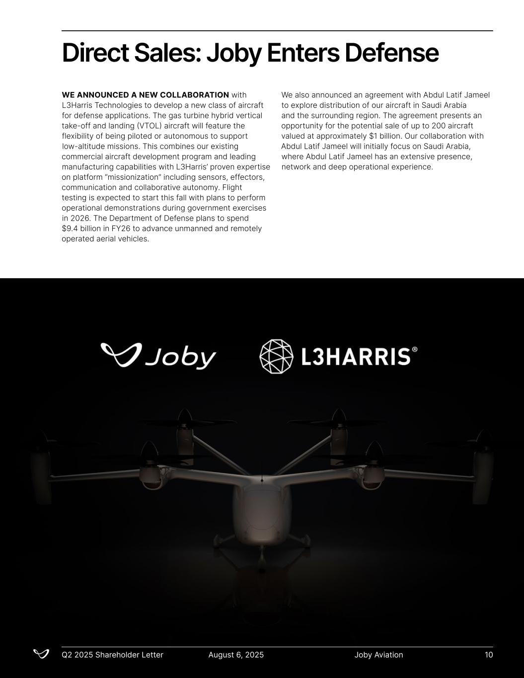 WE ANNOUNCED A NEW COLLABORATION with L3Harris Technologies to develop a new class of aircraft for defense applications. The gas turbine hybrid vertical take-off and landing (VTOL) aircraft will feature the flexibility of being piloted or autonomous to support low-altitude missions. This combines our existing commercial aircraft development program and leading manufacturing capabilities with L3Harris’ proven expertise on platform “missionization” including sensors, effectors, communication and collaborative autonomy. Flight testing is expected to start this fall with plans to perform operational demonstrations during government exercises in 2026. The Department of Defense plans to spend $9.4 billion in FY26 to advance unmanned and remotely operated aerial vehicles. We also announced an agreement with Abdul Latif Jameel to explore distribution of our aircraft in Saudi Arabia and the surrounding region. The agreement presents an opportunity for the potential sale of up to 200 aircraft valued at approximately $1 billion. Our collaboration with Abdul Latif Jameel will initially focus on Saudi Arabia, where Abdul Latif Jameel has an extensive presence, network and deep operational experience. Direct Sales: Joby Enters Defense Joby AviationQ2 2025 Shareholder Letter August 6, 2025 10