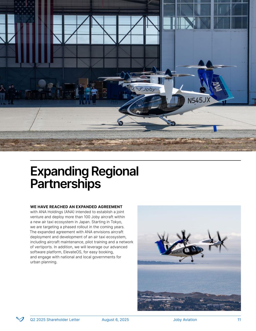 WE HAVE REACHED AN EXPANDED AGREEMENT with ANA Holdings (ANA) intended to establish a joint venture and deploy more than 100 Joby aircraft within a new air taxi ecosystem in Japan. Starting in Tokyo, we are targeting a phased rollout in the coming years. The expanded agreement with ANA envisions aircraft deployment and development of an air taxi ecosystem, including aircraft maintenance, pilot training and a network of vertiports. In addition, we will leverage our advanced software platform, ElevateOS, for easy booking, and engage with national and local governments for urban planning. Expanding Regional Partnerships Joby AviationQ2 2025 Shareholder Letter August 6, 2025 11