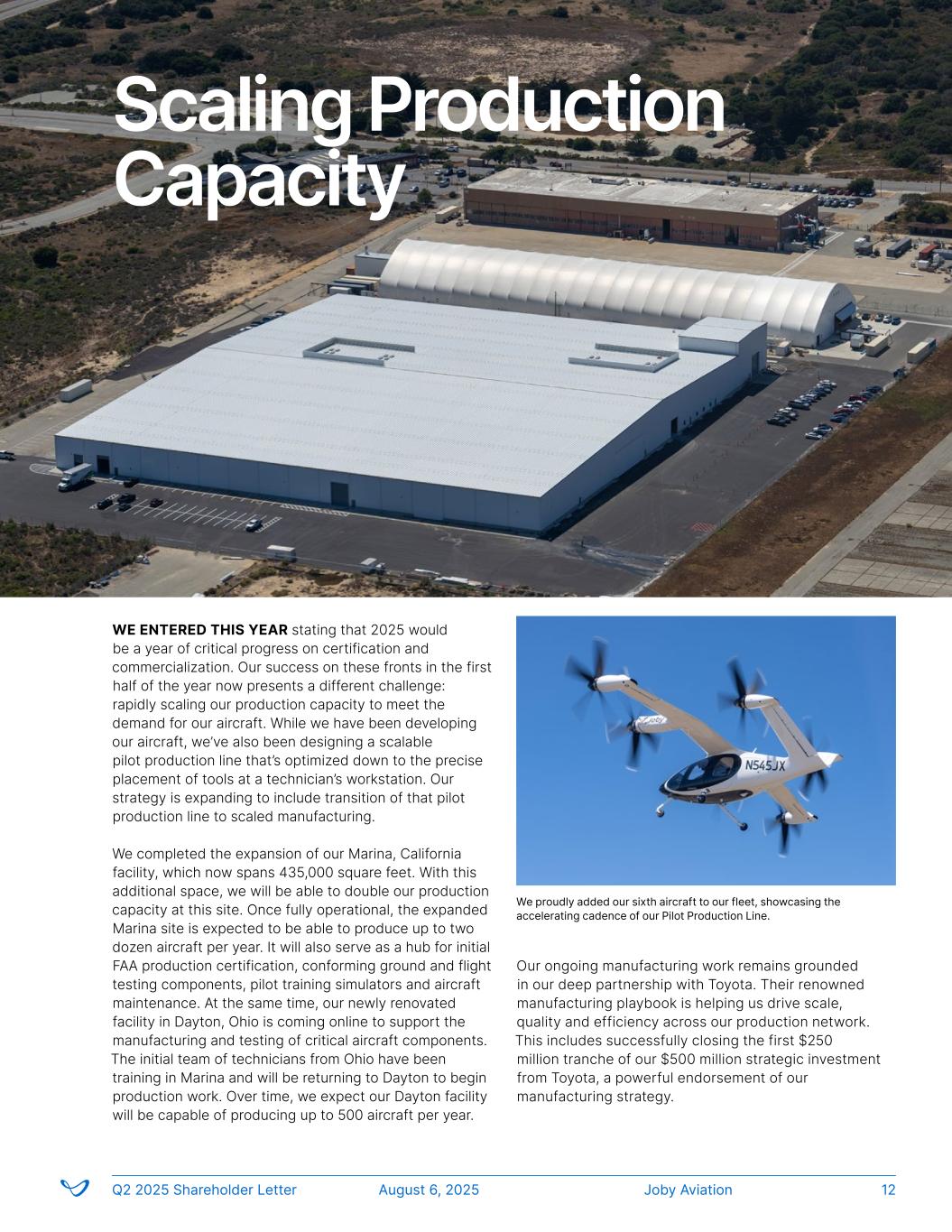 WE ENTERED THIS YEAR stating that 2025 would be a year of critical progress on certification and commercialization. Our success on these fronts in the first half of the year now presents a different challenge: rapidly scaling our production capacity to meet the demand for our aircraft. While we have been developing our aircraft, we’ve also been designing a scalable pilot production line that’s optimized down to the precise placement of tools at a technician’s workstation. Our strategy is expanding to include transition of that pilot production line to scaled manufacturing. We completed the expansion of our Marina, California facility, which now spans 435,000 square feet. With this additional space, we will be able to double our production capacity at this site. Once fully operational, the expanded Marina site is expected to be able to produce up to two dozen aircraft per year. It will also serve as a hub for initial FAA production certification, conforming ground and flight testing components, pilot training simulators and aircraft maintenance. At the same time, our newly renovated facility in Dayton, Ohio is coming online to support the manufacturing and testing of critical aircraft components. The initial team of technicians from Ohio have been training in Marina and will be returning to Dayton to begin production work. Over time, we expect our Dayton facility will be capable of producing up to 500 aircraft per year. Scaling Production Capacity Joby AviationQ2 2025 Shareholder Letter August 6, 2025 12 Our ongoing manufacturing work remains grounded in our deep partnership with Toyota. Their renowned manufacturing playbook is helping us drive scale, quality and efficiency across our production network. This includes successfully closing the first $250 million tranche of our $500 million strategic investment from Toyota, a powerful endorsement of our manufacturing strategy. We proudly added our sixth aircraft to our fleet, showcasing the accelerating cadence of our Pilot Production Line.