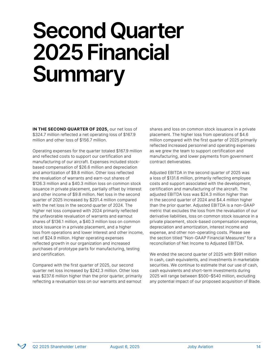 Second Quarter 2025 Financial Summary IN THE SECOND QUARTER OF 2025, our net loss of $324.7 million reflected a net operating loss of $167.9 million and other loss of $156.7 million. Operating expenses for the quarter totaled $167.9 million and reflected costs to support our certification and manufacturing of our aircraft. Expenses included stock- based compensation of $26.6 million and depreciation and amortization of $9.8 million. Other loss reflected the revaluation of warrants and earn-out shares of $126.3 million and a $40.3 million loss on common stock issuance in private placement, partially offset by interest and other income of $9.8 million. Net loss in the second quarter of 2025 increased by $201.4 million compared with the net loss in the second quarter of 2024. The higher net loss compared with 2024 primarily reflected the unfavorable revaluation of warrants and earnout shares of $136.1 million, a $40.3 million loss on common stock issuance in a private placement, and a higher loss from operations and lower interest and other income, net of $24.9 million. Higher operating expenses reflected growth in our organization and increased purchases of prototype parts for manufacturing, testing and certification. Compared with the first quarter of 2025, our second quarter net loss increased by $242.3 million. Other loss was $237.6 million higher than the prior quarter, primarily reflecting a revaluation loss on our warrants and earnout shares and loss on common stock issuance in a private placement. The higher loss from operations of $4.6 million compared with the first quarter of 2025 primarily reflected increased personnel and operating expenses as we grew the team to support certification and manufacturing, and lower payments from government contract deliverables. Adjusted EBITDA in the second quarter of 2025 was a loss of $131.6 million, primarily reflecting employee costs and support associated with the development, certification and manufacturing of the aircraft. The adjusted EBITDA loss was $24.3 million higher than in the second quarter of 2024 and $4.4 million higher than the prior quarter. Adjusted EBITDA is a non-GAAP metric that excludes the loss from the revaluation of our derivative liabilities, loss on common stock issuance in a private placement, stock-based compensation expense, depreciation and amortization, interest income and expense, and other non-operating costs. Please see the section titled “Non-GAAP Financial Measures” for a reconciliation of Net Income to Adjusted EBITDA. We ended the second quarter of 2025 with $991 million in cash, cash equivalents, and investments in marketable securities. We continue to estimate that our use of cash, cash equivalents and short-term investments during 2025 will range between $500–$540 million, excluding any potential impact of our proposed acquisition of Blade. Joby AviationQ2 2025 Shareholder Letter August 6, 2025 14