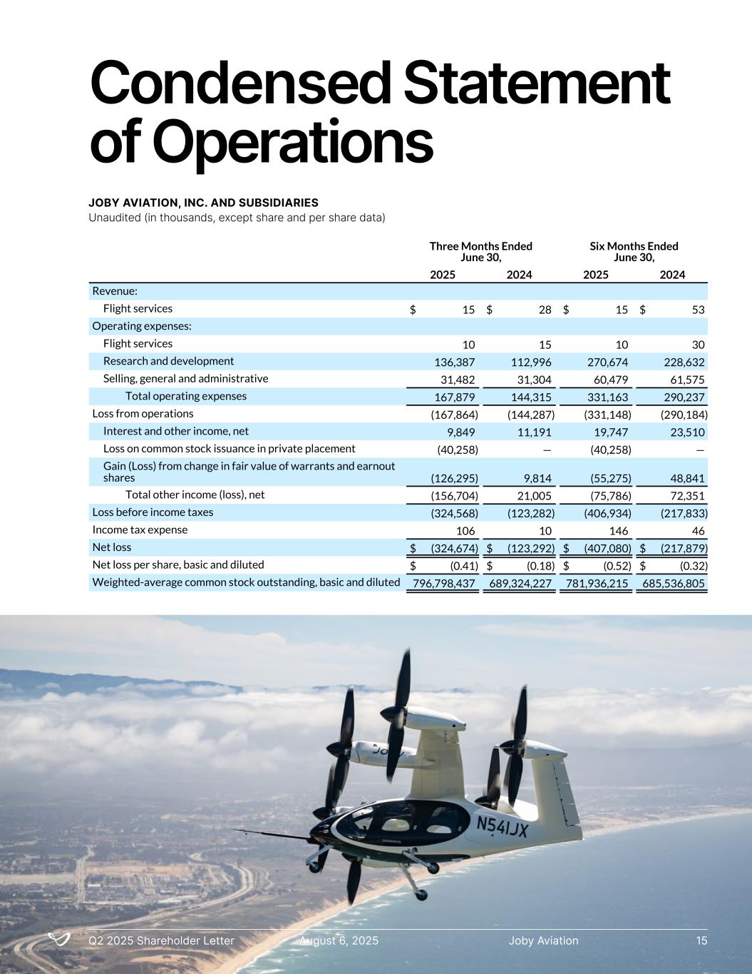 Condensed Statement of Operations JOBY AVIATION, INC. AND SUBSIDIARIES Unaudited (in thousands, except share and per share data) t rations JOBY AVIATION, INC. AND SUBSIDIARIES Unaudited (In thousands, except share and per share data) Three Months Ended June 30, Six Months Ended June 30, 2025 2024 2025 2024 Revenue: Flight services $ 15 $ 28 $ 15 $ 53 Operating expenses: Flight services 10 15 10 30 Research and development 136,387 112,996 270,674 228,632 Selling, general and administrative 31,482 31,304 60,479 61,575 Total operating expenses 167,879 144,315 331,163 290,237 Loss from operations (167,864) (144,287) (331,148) (290,184) Interest and other income, net 9,849 11,191 19,747 23,510 Loss on common stock issuance in private placement (40,258) — (40,258) — Gain (Loss) from change in fair value of warrants and earnout shares (126,295) 9,814 (55,275) 48,841 Total other income (loss), net (156,704) 21,005 (75,786) 72,351 Loss before income taxes (324,568) (123,282) (406,934) (217,833) Income tax expense 106 10 146 46 Net loss $ (324,674) $ (123,292) $ (407,080) $ (217,879) Net loss per share, basic and diluted $ (0.41) $ (0.18) $ (0.52) $ (0.32) Weighted-average common stock outstanding, basic and diluted 796,798,437 689,324,227 781,936,215 685,536,805 Q2 2025 Shareholder Letter August 6, 2025 Joby Aviation FS-1Joby AviationQ2 2025 Shareholder Letter August 6, 2025 15