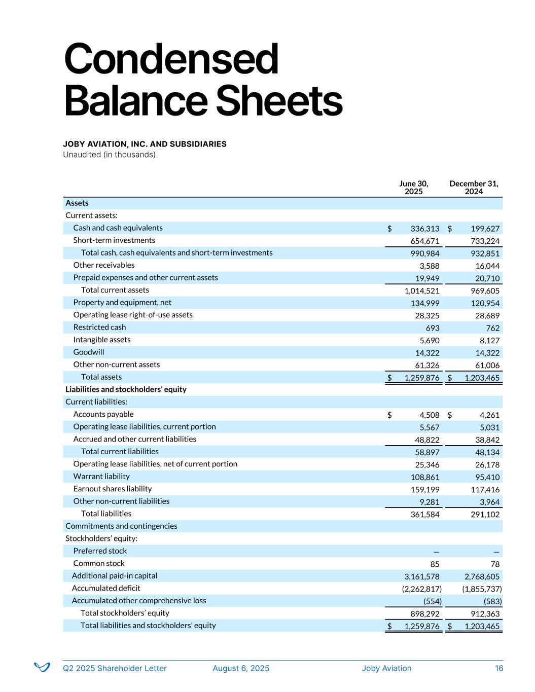Condensed Balance Sheets JOBY AVIATION, INC. AND SUBSIDIARIES Unaudited (In thousands) June 30, 2025 December 31, 2024 Assets Current assets: Cash and cash equivalents $ 336,313 $ 199,627 Short-term investments 654,671 733,224 Total cash, cash equivalents and short-term investments 990,984 932,851 Other receivables 3,588 16,044 Prepaid expenses and other current assets 19,949 20,710 Total current assets 1,014,521 969,605 Property and equipment, net 134,999 120,954 Operating lease right-of-use assets 28,325 28,689 Restricted cash 693 762 Intangible assets 5,690 8,127 Goodwill 14,322 14,322 Other non-current assets 61,326 61,006 Total assets $ 1,259,876 $ 1,203,465 Liabilities and stockholders’ equity Current liabilities: Accounts payable $ 4,508 $ 4,261 Operating lease liabilities, current portion 5,567 5,031 Accrued and other current liabilities 48,822 38,842 Total current liabilities 58,897 48,134 Operating lease liabilities, net of current portion 25,346 26,178 Warrant liability 108,861 95,410 Earnout shares liability 159,199 117,416 Other non-current liabilities 9,281 3,964 Total liabilities 361,584 291,102 Commitments and contingencies Stockholders’ equity: Preferred stock — — Common stock 85 78 Additional paid-in capital 3,161,578 2,768,605 Accumulated deficit (2,262,817) (1,855,737) Accumulated other comprehensive loss (554) (583) Total stockholders’ equity 898,292 912,363 Total liabilities and stockholders’ equity $ 1,259,876 $ 1,203,465 Q2 2025 Shareholder Letter August 6, 2025 Joby Aviation FS-2 Condensed Balance Sheets JOBY AVIATION, INC. AND SUBSIDIARIES Unaudited (in thousands) Joby AviationQ2 2025 Shareholder Letter August 6, 2025 16