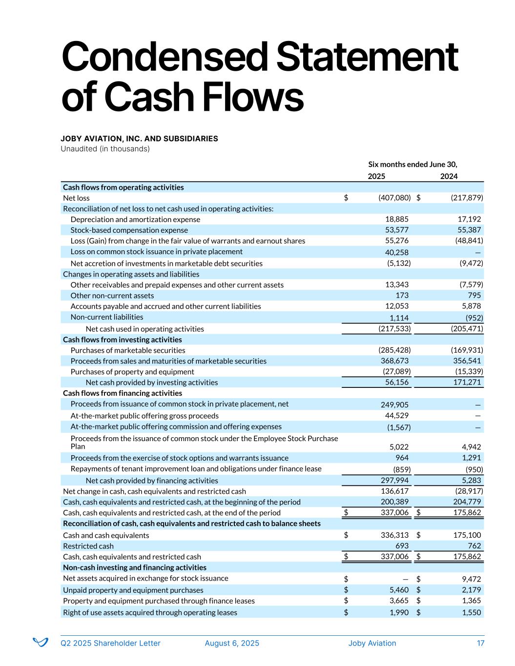 Condensed Statement of Cash Flows JOBY AVIATION, INC. AND SUBSIDIARIES Unaudited (In thousands) Six months ended June 30, 2025 2024 Cash flows from operating activities Net loss $ (407,080) $ (217,879) Reconciliation of net loss to net cash used in operating activities: Depreciation and amortization expense 18,885 17,192 Stock-based compensation expense 53,577 55,387 Loss (Gain) from change in the fair value of warrants and earnout shares 55,276 (48,841) Loss on common stock issuance in private placement 40,258 — Net accretion of investments in marketable debt securities (5,132) (9,472) Changes in operating assets and liabilities Other receivables and prepaid expenses and other current assets 13,343 (7,579) Other non-current assets 173 795 Accounts payable and accrued and other current liabilities 12,053 5,878 Non-current liabilities 1,114 (952) Net cash used in operating activities (217,533) (205,471) Cash flows from investing activities Purchases of marketable securities (285,428) (169,931) Proceeds from sales and maturities of marketable securities 368,673 356,541 Purchases of property and equipment (27,089) (15,339) Net cash provided by investing activities 56,156 171,271 Cash flows from financing activities Proceeds from issuance of common stock in private placement, net 249,905 — At-the-market public offering gross proceeds 44,529 — At-the-market public offering commission and offering expenses (1,567) — Proceeds from the issuance of common stock under the Employee Stock Purchase Plan 5,022 4,942 Proceeds from the exercise of stock options and warrants issuance 964 1,291 Repayments of tenant improvement loan and obligations under finance lease (859) (950) Net cash provided by financing activities 297,994 5,283 Net change in cash, cash equivalents and restricted cash 136,617 (28,917) Cash, cash equivalents and restricted cash, at the beginning of the period 200,389 204,779 Cash, cash equivalents and restricted cash, at the end of the period $ 337,006 $ 175,862 Reconciliation of cash, cash equivalents and restricted cash to balance sheets Cash and cash equivalents $ 336,313 $ 175,100 Restricted cash 693 762 Cash, cash equivalents and restricted cash $ 337,006 $ 175,862 Non-cash investing and financing activities Net assets acquired in exchange for stock issuance $ — $ 9,472 Unpaid property and equipment purchases $ 5,460 $ 2,179 Property and equipment purchased through finance leases $ 3,665 $ 1,365 Right of use assets acquired through operating leases $ 1,990 $ 1,550 Q2 2025 Shareholder Letter August 6, 2025 Joby Aviation FS-3 Condensed State ent of Cash Flo s JOBY AVIATION, INC. AND SUBSIDIARIES Unaudited (in thousands) Joby AviationQ2 2025 Shareholder Letter August 6, 2025 17
