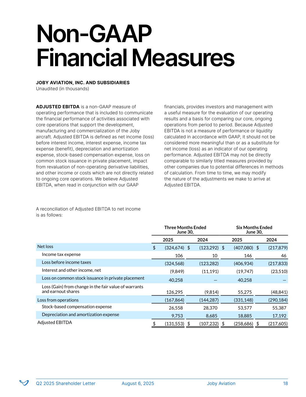 Non-GAAP Financial Measures JOBY AVIATION, INC. AND SUBSIDIARIES Unaudited (in thousands) Joby AviationQ2 2025 Shareholder Letter August 6, 2025 18 Non-GAAP Financial Measures JOBY AVIATION, INC. AND SUBSIDIARIES Unaudited (In thousands) ADJUSTED EBITDA is a non-GAAP measure of operating performance that is included to communicate the financial performance of activities associated with core operations that support the development, manufacturing and commercialization of the Joby aircraft. Adjusted EBITDA is defined as net income (loss) before interest income, interest expense, income tax expense (benefit), depreciation and amortization expense, stock-based compensation expense, loss on common stock issuance in private placement, impact from revaluation of non-operating derivative liabilities, and other income or costs which are not directly related to ongoing core operations. We believe Adjusted EBITDA, when read in conjunction with our GAAP financials, provides investors and management with a useful measure for the evaluation of our operating results and a basis for comparing our core, ongoing operations from period to period. Because Adjusted EBITDA is not a measure of performance or liquidity calculated in accordance with GAAP, it should not be considered more meaningful than or as a substitute for net income (loss) as an indicator of our operating performance. Adjusted EBITDA may not be directly comparable to similarly titled measures provided by other companies due to potential differences in methods of calculation. From time to time, we may modify the nature of the adjustments we make to arrive at Adjusted EBITDA. A reconciliation of Adjusted EBITDA to net income is as follows: Three Months Ended June 30, Six Months Ended June 30, 2025 2024 2025 2024 Net loss $ (324,674) $ (123,292) $ (407,080) $ (217,879) Income tax expense 106 10 146 46 Loss before income taxes (324,568) (123,282) (406,934) (217,833) Interest and other income, net (9,849) (11,191) (19,747) (23,510) Loss on common stock issuance in private placement 40,258 — 40,258 — Loss (Gain) from change in the fair value of warrants and earnout shares 126,295 (9,814) 55,275 (48,841) Loss from operations (167,864) (144,287) (331,148) (290,184) Stock-based compensation expense 26,558 28,370 53,577 55,387 Depreciation and amortization expense 9,753 8,685 18,885 17,192 Adjusted EBITDA $ (131,553) $ (107,232) $ (258,686) $ (217,605) Q2 2025 Shareholder Letter August 6, 2025 Joby Aviation FS-4 ADJUSTED EBITDA is a non-GAAP measure of operating performance that is included to communicate the financial performance of activities associated with core operations that support the development, manufacturing and commercialization of the Joby aircraft. Adjusted EBITDA is defined as net income (loss) before interest income, inter st expense, income tax expense (benefit), depreciation and amortization expense, stock-based compensation expense, loss on common stock issuance in private placement, impact from revaluation of non-operating derivative liabilities, and other in me or costs which ar not directly related to ongoing core operations. We believe Adjusted EBITDA, when read in conjunction with our GAAP financials, provides investors and management with a useful r l ation of our operating results and a basis for co paring our core, ongoing operations from period to period. Because Adjusted EBITDA is not a measure of performance or liquidity calculated in accordance with GAAP, it should not be considered more mea gful han or as a substitute for net income (loss) as an indicator of our operating performance. Adjusted EBITDA may not be directly comparable to similarly titled measures provided by other companies due to potential differences in methods of calculation. From time to time, we may modify the nature of the adjustments we make to arrive at Adjusted EBITDA. A reconciliation of Adjusted EBITDA to net income is as follows: