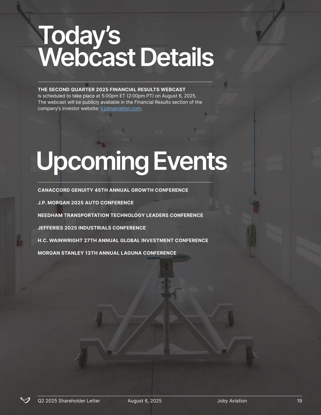 Upcoming Events Today’s Webcast Details THE SECOND QUARTER 2025 FINANCIAL RESULTS WEBCAST is scheduled to take place at 5:00pm ET (2:00pm PT) on August 6, 2025. The webcast will be publicly available in the Financial Results section of the company’s investor website: ir.jobyaviation.com. CANACCORD GENUITY 45TH ANNUAL GROWTH CONFERENCE J.P. MORGAN 2025 AUTO CONFERENCE NEEDHAM TRANSPORTATION TECHNOLOGY LEADERS CONFERENCE JEFFERIES 2025 INDUSTRIALS CONFERENCE H.C. WAINWRIGHT 27TH ANNUAL GLOBAL INVESTMENT CONFERENCE MORGAN STANLEY 13TH ANNUAL LAGUNA CONFERENCE Joby AviationQ2 2025 Shareholder Letter August 6, 2025 19