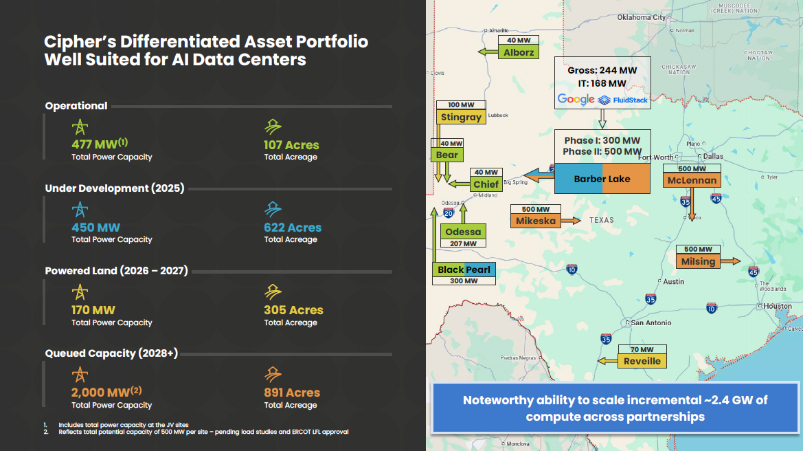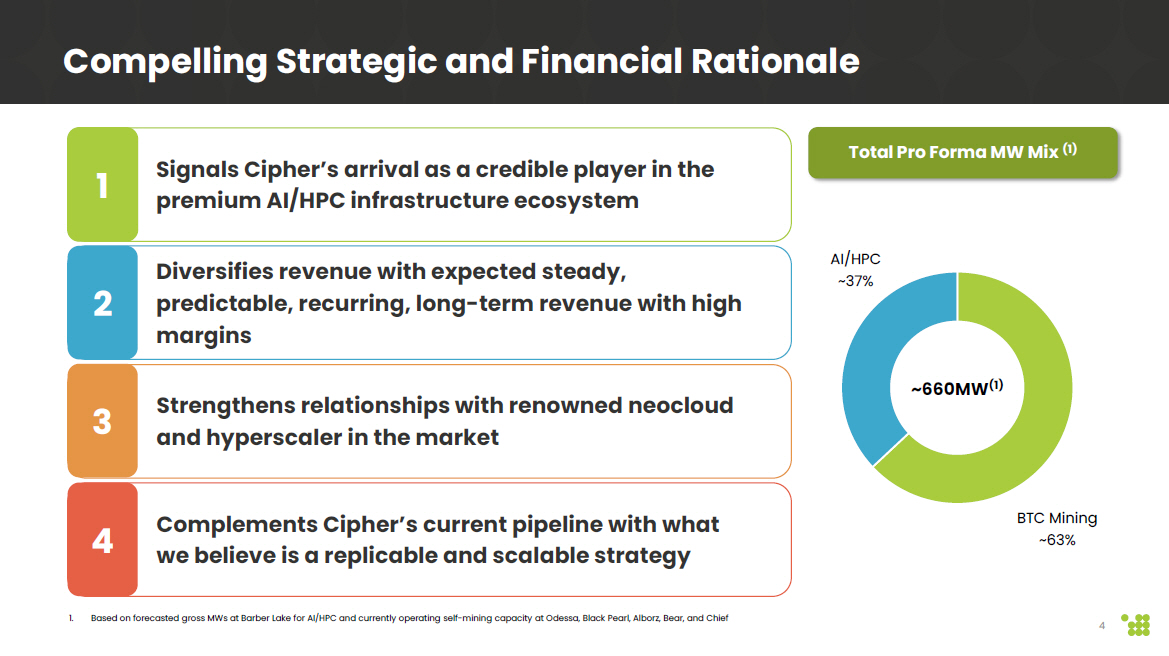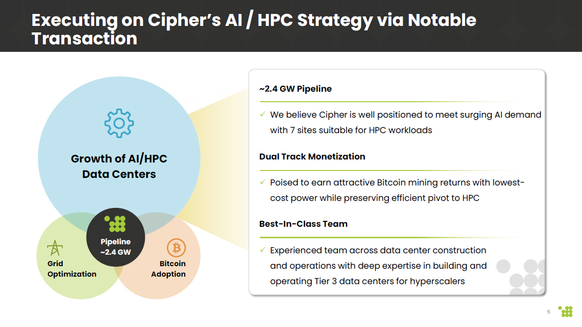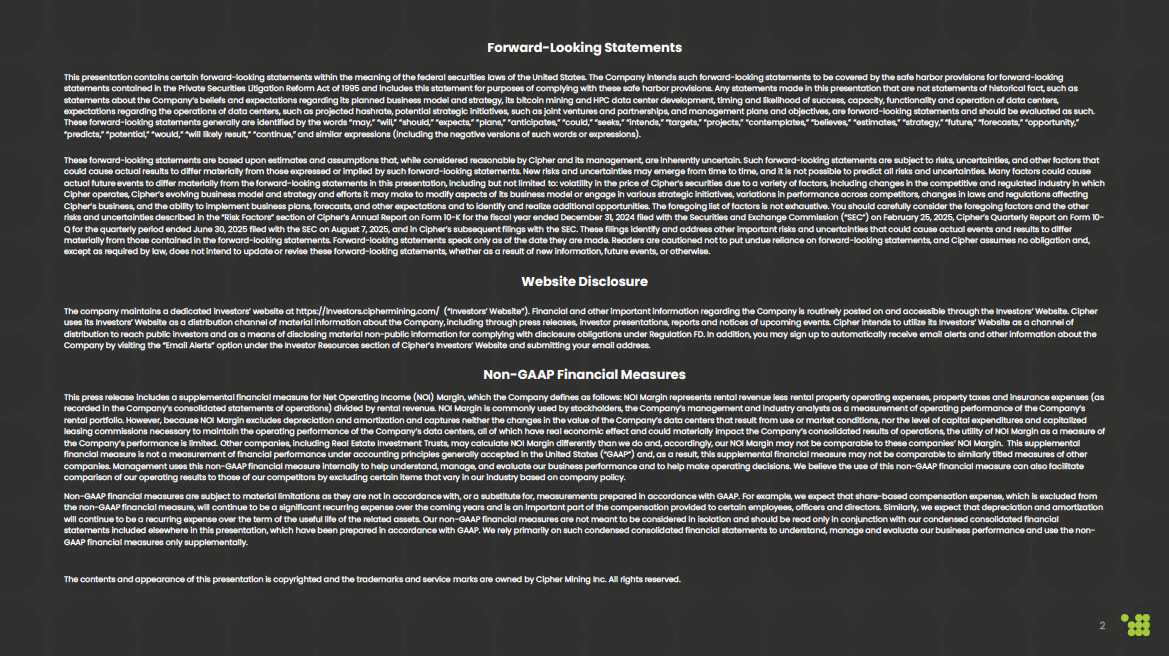 Forward - Looking Statements This presentation contains certain forward - looking statements within the meaning of the federal securities laws of the United St ates. The Company intends such forward - looking statements to be covered by the safe harbor provisions for forward - looking statements contained in the Private Securities Litigation Reform Act of 1995 and includes this statement for purposes of comp lyi ng with these safe harbor provisions. Any statements made in this presentation that are not statements of historical fact, su ch as statements about the Company’s beliefs and expectations regarding its planned business model and strategy, its bitcoin mining an d HPC data center development, timing and likelihood of success, capacity, functionality and operation of data centers, expectations regarding the operations of data centers, such as projected hashrate , potential strategic initiatives, such as joint ventures and partnerships, and management plans and objectives, are forward - loo king statements and should be evaluated as such. These forward - looking statements generally are identified by the words “may,” “will,” “should,” “expects,” “plans,” “anticipates ,” “could,” “seeks,” “intends,” “targets,” “projects,” “contemplates,” “believes,” “estimates,” “strategy,” “future,” “foreca sts ,” “opportunity,” “predicts,” “potential,” “would,” “will likely result,” “continue,” and similar expressions (including the negative versions of such words or expressions). These forward - looking statements are based upon estimates and assumptions that, while considered reasonable by Cipher and its ma nagement, are inherently uncertain. Such forward - looking statements are subject to risks, uncertainties, and other factors that could cause actual results to differ materially from those expressed or implied by such forward - looking statements. New risks an d uncertainties may emerge from time to time, and it is not possible to predict all risks and uncertainties. Many factors cou ld cause actual future events to differ materially from the forward - looking statements in this presentation, including but not limited to : volatility in the price of Cipher’s securities due to a variety of factors, including changes in the competitive and regula ted industry in which Cipher operates, Cipher’s evolving business model and strategy and efforts it may make to modify aspects of its business mode l o r engage in various strategic initiatives, variations in performance across competitors, changes in laws and regulations affe cti ng Cipher’s business, and the ability to implement business plans, forecasts, and other expectations and to identify and realize ad ditional opportunities. The foregoing list of factors is not exhaustive. You should carefully consider the foregoing factors and the other risks and uncertainties described in the “Risk Factors” section of Cipher’s Annual Report on Form 10 - K for the fiscal year ended December 31, 2024 filed with the Securities and Exchange Commission (“SEC”) on February 25, 2025, Cipher’s Quarterly Report o n Form 10 - Q for the quarterly period ended June 30, 2025 filed with the SEC on August 7, 2025, and in Cipher’s subsequent filings with the SEC. These filings identify and address other important risks and uncertainties that could cause actual events and results to d iffer materially from those contained in the forward - looking statements. Forward - looking statements speak only as of the date they are made. Readers are cautioned not to put undue reliance on forward - looking statements, and Cipher assumes no obligation and, except as required by law, does not intend to update or revise these forward - looking statements, whether as a result of new info rmation, future events, or otherwise. Website Disclosure The company maintains a dedicated investors’ website at https://investors.ciphermining.com/ (“Investors’ Website”). Financia l a nd other important information regarding the Company is routinely posted on and accessible through the Investors’ Website. Ci phe r uses its Investors’ Website as a distribution channel of material information about the Company, including through press rele ase s, investor presentations, reports and notices of upcoming events. Cipher intends to utilize its Investors’ Website as a chan nel of distribution to reach public investors and as a means of disclosing material non - public information for complying with disclosur e obligations under Regulation FD. In addition, you may sign up to automatically receive email alerts and other information a bou t the Company by visiting the “Email Alerts” option under the Investor Resources section of Cipher’s Investors’ Website and submitt ing your email address. Non - GAAP Financial Measures This press release includes a supplemental financial measure for Net Operating Income (NOI) Margin, which the Company defines as follows: NOI Margin represents rental revenue less rental property operating expenses, property taxes and insurance expenses (a s recorded in the Company’s consolidated statements of operations) divided by rental revenue. NOI Margin is commonly used by st ock holders, the Company’s management and industry analysts as a measurement of operating performance of the Company’s rental portfolio. However, because NOI Margin excludes depreciation and amortization and captures neither the changes in the val ue of the Company’s data centers that result from use or market conditions, nor the level of capital expenditures and capital ize d leasing commissions necessary to maintain the operating performance of the Company’s data centers, all of which have real eco nom ic effect and could materially impact the Company’s consolidated results of operations, the utility of NOI Margin as a measur e o f the Company’s performance is limited. Other