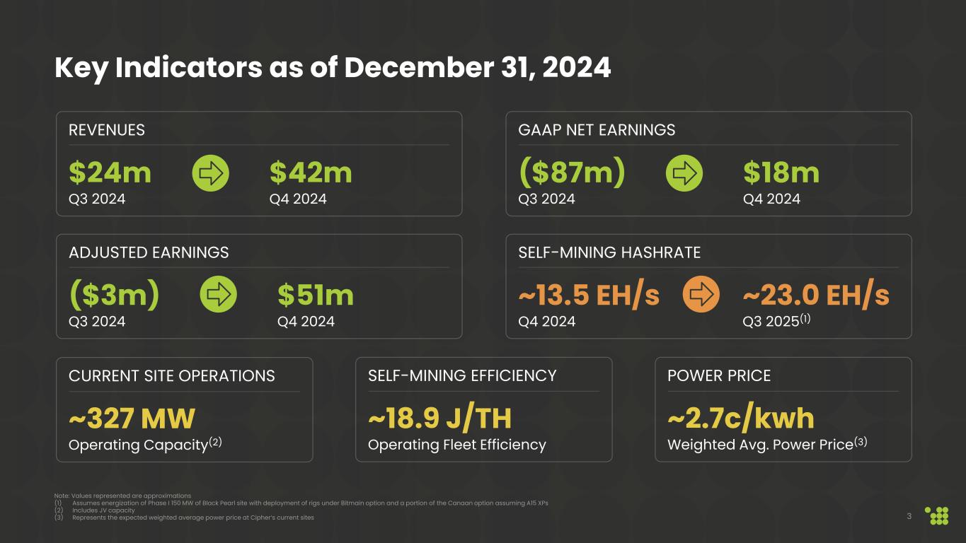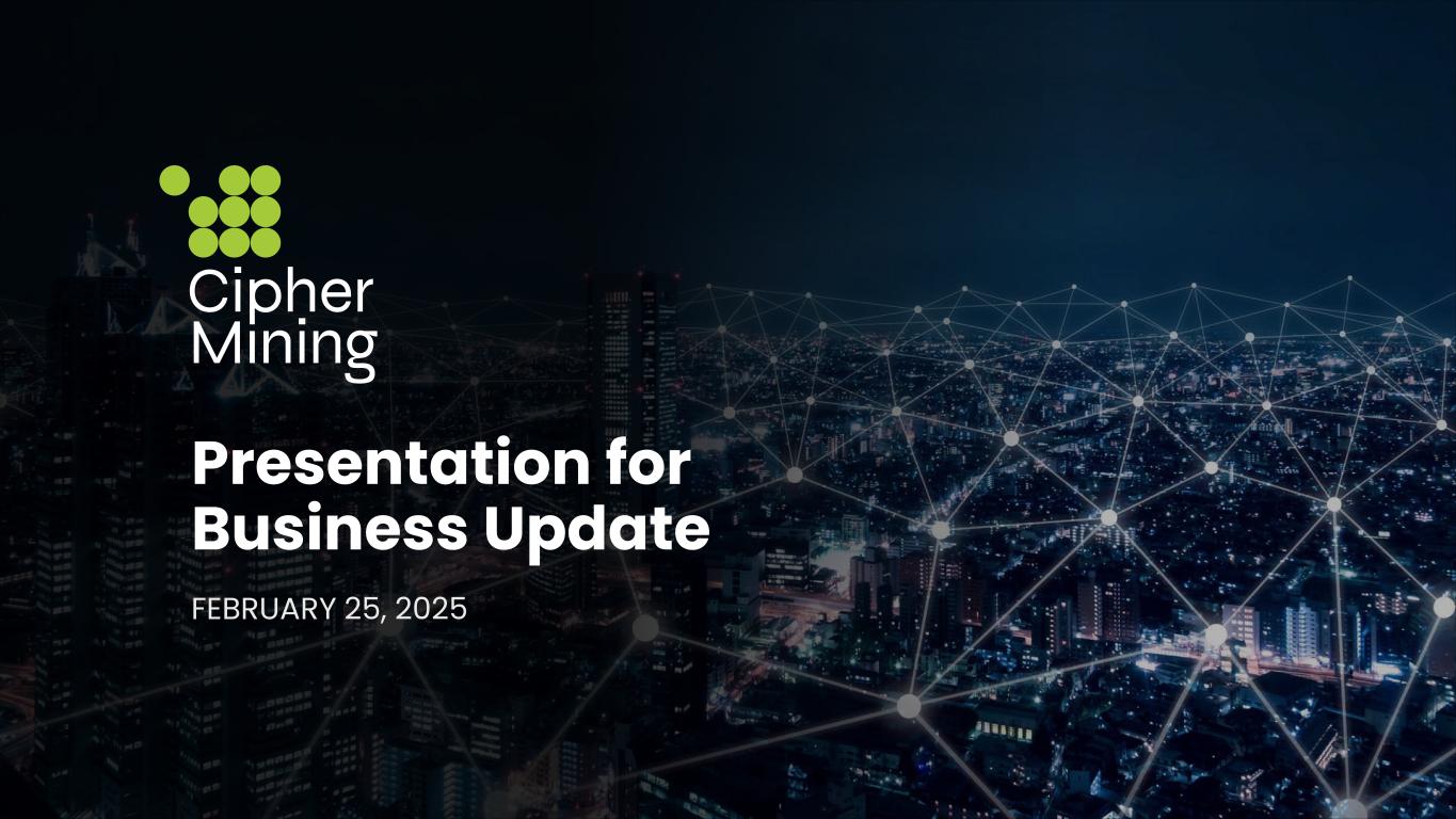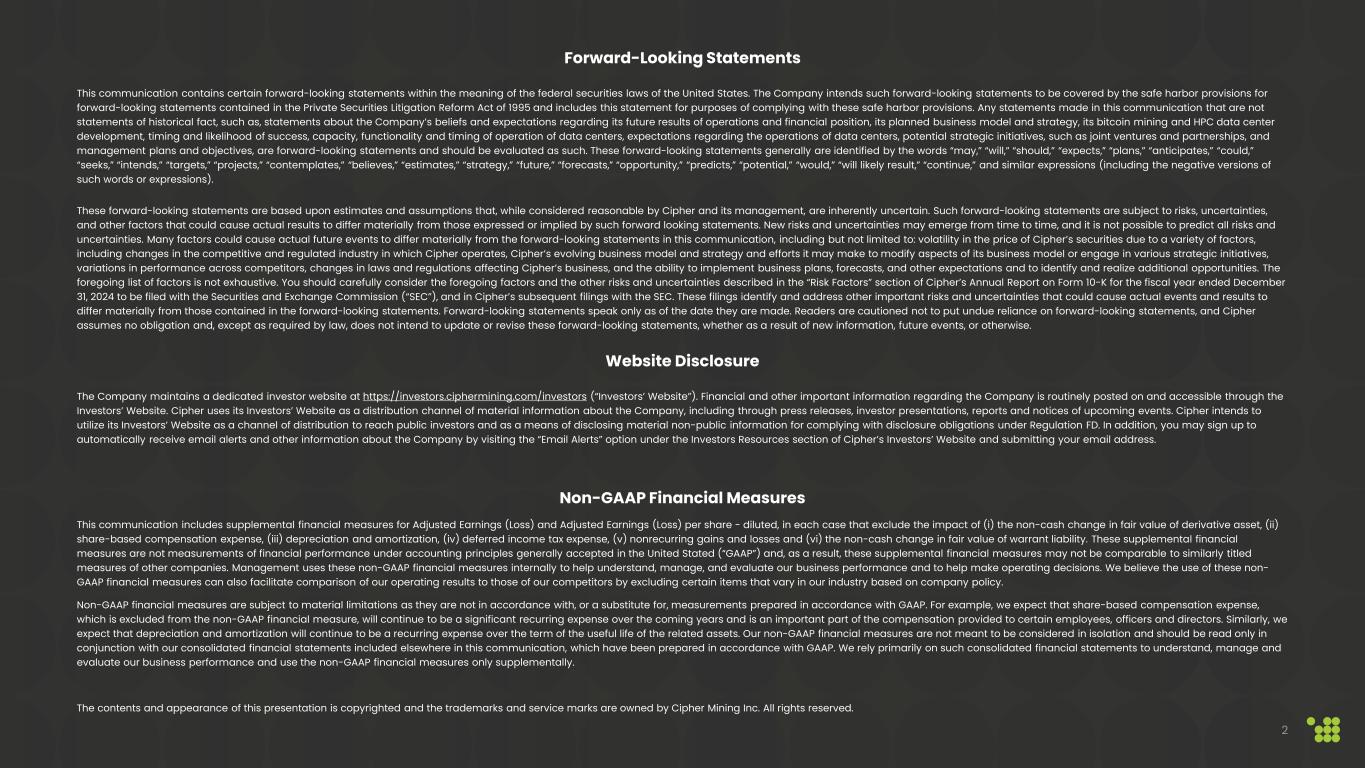 Forward-Looking Statements This communication contains certain forward-looking statements within the meaning of the federal securities laws of the United States. The Company intends such forward-looking statements to be covered by the safe harbor provisions for forward-looking statements contained in the Private Securities Litigation Reform Act of 1995 and includes this statement for purposes of complying with these safe harbor provisions. Any statements made in this communication that are not statements of historical fact, such as, statements about the Company’s beliefs and expectations regarding its future results of operations and financial position, its planned business model and strategy, its bitcoin mining and HPC data center development, timing and likelihood of success, capacity, functionality and timing of operation of data centers, expectations regarding the operations of data centers, potential strategic initiatives, such as joint ventures and partnerships, and management plans and objectives, are forward-looking statements and should be evaluated as such. These forward-looking statements generally are identified by the words “may,” “will,” “should,” “expects,” “plans,” “anticipates,” “could,” “seeks,” “intends,” “targets,” “projects,” “contemplates,” “believes,” “estimates,” “strategy,” “future,” “forecasts,” “opportunity,” “predicts,” “potential,” “would,” “will likely result,” “continue,” and similar expressions (including the negative versions of such words or expressions). These forward-looking statements are based upon estimates and assumptions that, while considered reasonable by Cipher and its management, are inherently uncertain. Such forward-looking statements are subject to risks, uncertainties, and other factors that could cause actual results to differ materially from those expressed or implied by such forward looking statements. New risks and uncertainties may emerge from time to time, and it is not possible to predict all risks and uncertainties. Many factors could cause actual future events to differ materially from the forward-looking statements in this communication, including but not limited to: volatility in the price of Cipher’s securities due to a variety of factors, including changes in the competitive and regulated industry in which Cipher operates, Cipher’s evolving business model and strategy and efforts it may make to modify aspects of its business model or engage in various strategic initiatives, variations in performance across competitors, changes in laws and regulations affecting Cipher’s business, and the ability to implement business plans, forecasts, and other expectations and to identify and realize additional opportunities. The foregoing list of factors is not exhaustive. You should carefully consider the foregoing factors and the other risks and uncertainties described in the “Risk Factors” section of Cipher’s Annual Report on Form 10-K for the fiscal year ended December 31, 2024 to be filed with the Securities and Exchange Commission (“SEC”), and in Cipher’s subsequent filings with the SEC. These filings identify and address other important risks and uncertainties that could cause actual events and results to differ materially from those contained in the forward-looking statements. Forward-looking statements speak only as of the date they are made. Readers are cautioned not to put undue reliance on forward-looking statements, and Cipher assumes no obligation and, except as required by law, does not intend to update or revise these forward-looking statements, whether as a result of new information, future events, or otherwise. Website Disclosure The Company maintains a dedicated investor website at https://investors.ciphermining.com/investors (“Investors’ Website”). Financial and other important information regarding the Company is routinely posted on and accessible through the Investors’ Website. Cipher uses its Investors’ Website as a distribution channel of material information about the Company, including through press releases, investor presentations, reports and notices of upcoming events. Cipher intends to utilize its Investors’ Website as a channel of distribution to reach public investors and as a means of disclosing material non-public information for complying with disclosure obligations under Regulation FD. In addition, you may sign up to automatically receive email alerts and other information about the Company by visiting the “Email Alerts” option under the Investors Resources section of Cipher’s Investors’ Website and submitting your email address. Non-GAAP Financial Measures This communication includes supplemental financial measures for Adjusted Earnings (Loss) and Adjusted Earnings (Loss) per share - diluted, in each case that exclude the impact of (i) the non-cash change in fair value of derivative asset, (ii) share-based compensation expense, (iii) depreciation and amortization, (iv) deferred income tax expense, (v) nonrecurring gains and losses and (vi) the non-cash change in fair value of warrant liability. These supplemental financial measures are not measurements of financial performance under accounting principles generally accepted in the United Stated (“GAAP”) and, as a result, these supplemental financial measures may not be comparable to similarly titled measures of other companies. Management uses these non-GAAP financial measures internally to help understand, manage, and evaluate our business performance and to help make operating decisions. We believe the use of these non- GAAP financial measures can also facilitate comparison of our operating results to those of our competitors by excluding certain items that vary in our industry based on company policy. Non-GAAP financial measures are subject to material limitations as they are not in accordance with, or a substitute for, 