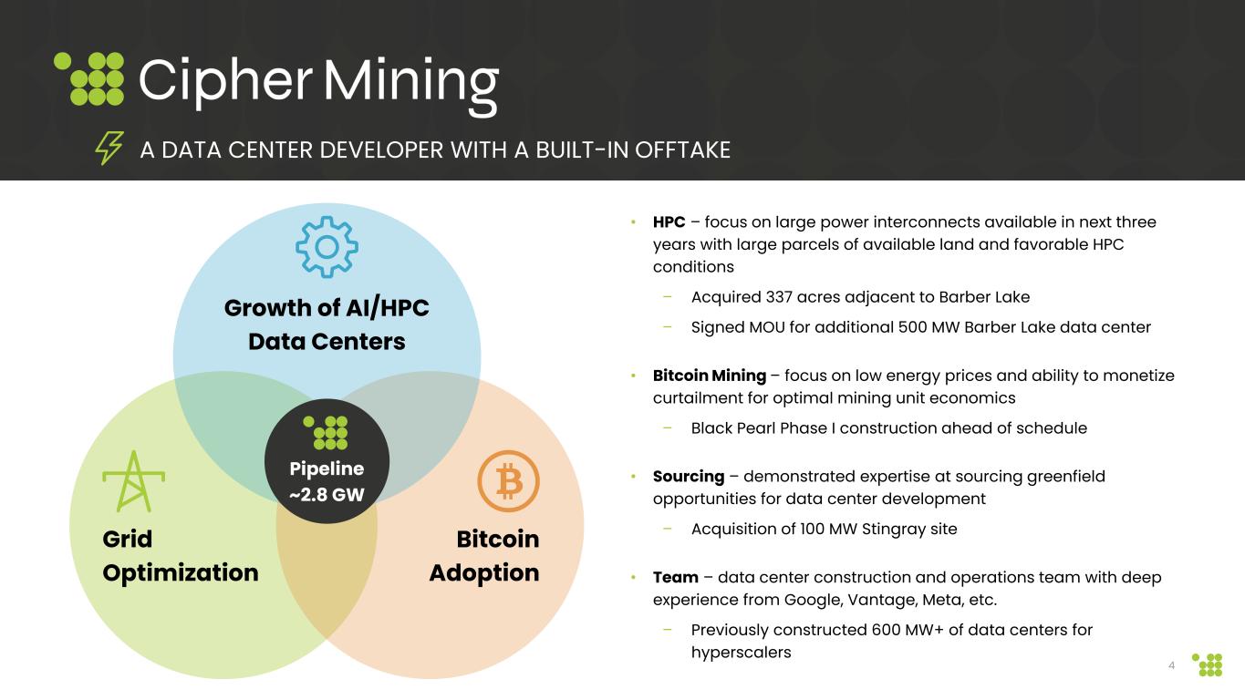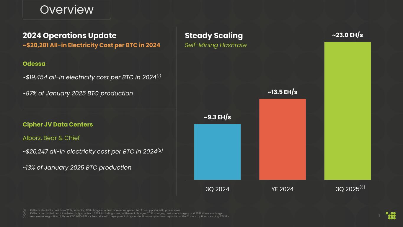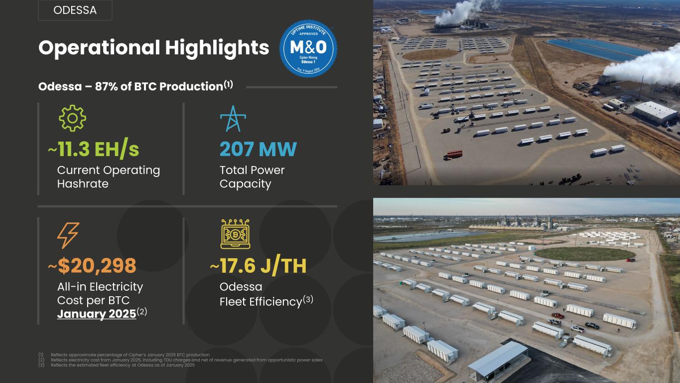Forward-Looking Statements This communication contains certain forward-looking statements within the meaning of the federal securities laws of the United States. The Company intends such forward-looking statements to be covered by the safe harbor provisions for forward-looking statements contained in the Private Securities Litigation Reform Act of 1995 and includes this statement for purposes of complying with these safe harbor provisions. Any statements made in this communication that are not statements of historical fact, such as, statements about the Company’s beliefs and expectations regarding its future results of operations and financial position, its planned business model and strategy, its bitcoin mining and HPC data center development, timing and likelihood of success, capacity, functionality and timing of operation of data centers, expectations regarding the operations of data centers, potential strategic initiatives, such as joint ventures and partnerships, and management plans and objectives, are forward-looking statements and should be evaluated as such. These forward-looking statements generally are identified by the words “may,” “will,” “should,” “expects,” “plans,” “anticipates,” “could,” “seeks,” “intends,” “targets,” “projects,” “contemplates,” “believes,” “estimates,” “strategy,” “future,” “forecasts,” “opportunity,” “predicts,” “potential,” “would,” “will likely result,” “continue,” and similar expressions (including the negative versions of such words or expressions). These forward-looking statements are based upon estimates and assumptions that, while considered reasonable by Cipher and its management, are inherently uncertain. Such forward-looking statements are subject to risks, uncertainties, and other factors that could cause actual results to differ materially from those expressed or implied by such forward looking statements. New risks and uncertainties may emerge from time to time, and it is not possible to predict all risks and uncertainties. Many factors could cause actual future events to differ materially from the forward-looking statements in this communication, including but not limited to: volatility in the price of Cipher’s securities due to a variety of factors, including changes in the competitive and regulated industry in which Cipher operates, Cipher’s evolving business model and strategy and efforts it may make to modify aspects of its business model or engage in various strategic initiatives, variations in performance across competitors, changes in laws and regulations affecting Cipher’s business, and the ability to implement business plans, forecasts, and other expectations and to identify and realize additional opportunities. The foregoing list of factors is not exhaustive. You should carefully consider the foregoing factors and the other risks and uncertainties described in the “Risk Factors” section of Cipher’s Annual Report on Form 10-K for the fiscal year ended December 31, 2024 to be filed with the Securities and Exchange Commission (“SEC”), and in Cipher’s subsequent filings with the SEC. These filings identify and address other important risks and uncertainties that could cause actual events and results to differ materially from those contained in the forward-looking statements. Forward-looking statements speak only as of the date they are made. Readers are cautioned not to put undue reliance on forward-looking statements, and Cipher assumes no obligation and, except as required by law, does not intend to update or revise these forward-looking statements, whether as a result of new information, future events, or otherwise. Website Disclosure The Company maintains a dedicated investor website at https://investors.ciphermining.com/investors (“Investors’ Website”). Financial and other important information regarding the Company is routinely posted on and accessible through the Investors’ Website. Cipher uses its Investors’ Website as a distribution channel of material information about the Company, including through press releases, investor presentations, reports and notices of upcoming events. Cipher intends to utilize its Investors’ Website as a channel of distribution to reach public investors and as a means of disclosing material non-public information for complying with disclosure obligations under Regulation FD. In addition, you may sign up to automatically receive email alerts and other information about the Company by visiting the “Email Alerts” option under the Investors Resources section of Cipher’s Investors’ Website and submitting your email address. Non-GAAP Financial Measures This communication includes supplemental financial measures for Adjusted Earnings (Loss) and Adjusted Earnings (Loss) per share - diluted, in each case that exclude the impact of (i) the non-cash change in fair value of derivative asset, (ii) share-based compensation expense, (iii) depreciation and amortization, (iv) deferred income tax expense, (v) nonrecurring gains and losses and (vi) the non-cash change in fair value of warrant liability. These supplemental financial measures are not measurements of financial performance under accounting principles generally accepted in the United Stated (“GAAP”) and, as a result, these supplemental financial measures may not be comparable to similarly titled measures of other companies. Management uses these non-GAAP financial measures internally to help understand, manage, and evaluate our business performance and to help make operating decisions. We believe the use of these non- GAAP financial measures can also facilitate comparison of our operating results to those of our competitors by excluding certain items that vary in our industry based on company policy. Non-GAAP financial measures are subject to material limitations as they are not in accordance with, or a substitute for, 